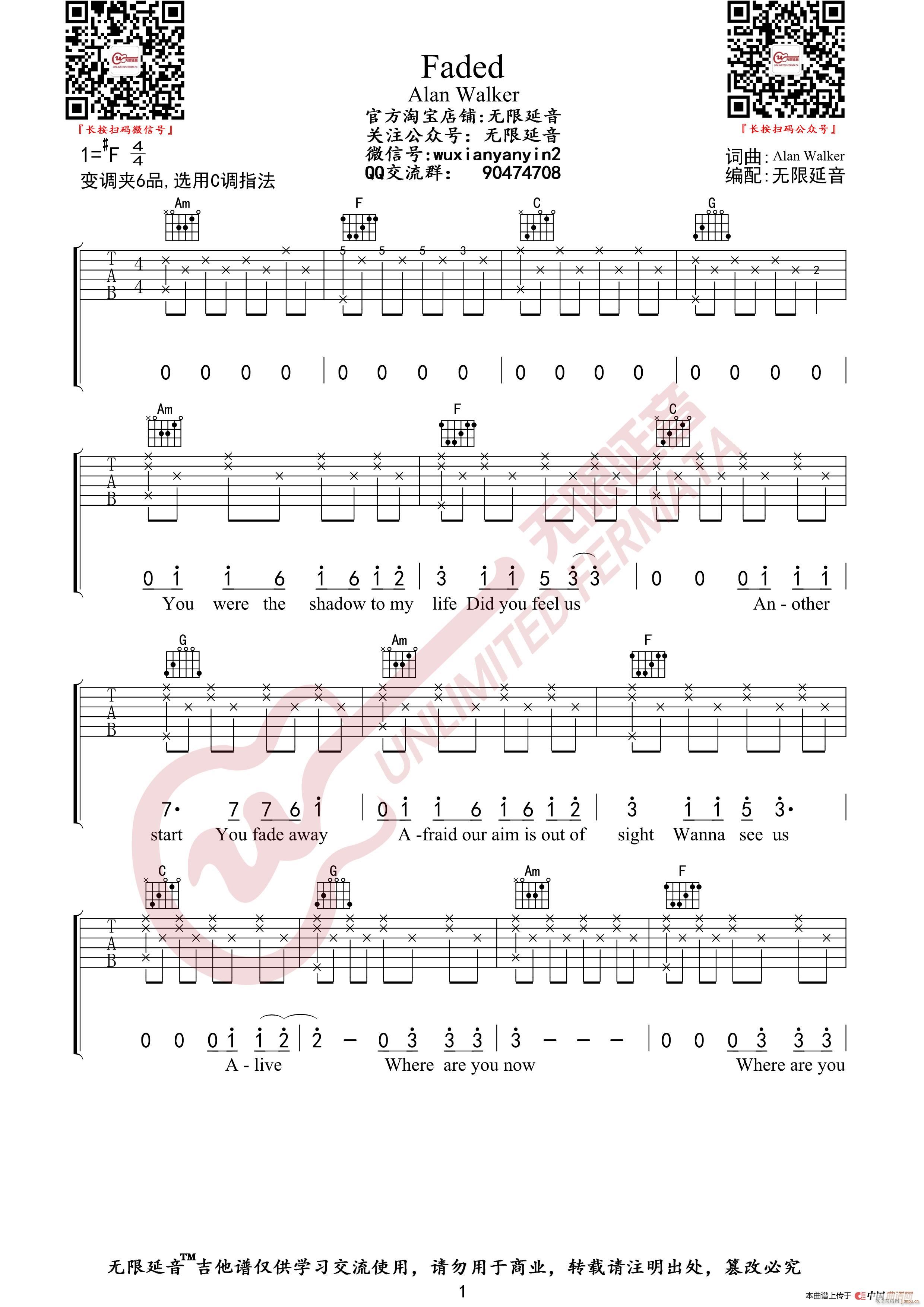 公众号:绵羊乐谱 Alan Walker - Faded (无限延音编配) 免费弹唱吉他谱_六线谱/词曲: 点击: (网络) 公众号:绵羊乐谱 | 官方QQ群:978773290 不吃独食,学会分享!本文链接:http://www.shaomingyang.com/btb/33756.html 转载请标明出处,尊重原创(๑╹◡╹)ノ。如信息有误或版权疑问,请通过网站底部联系我们会第一时间处理,感谢理解支持(◕ᴗ◕✿)!