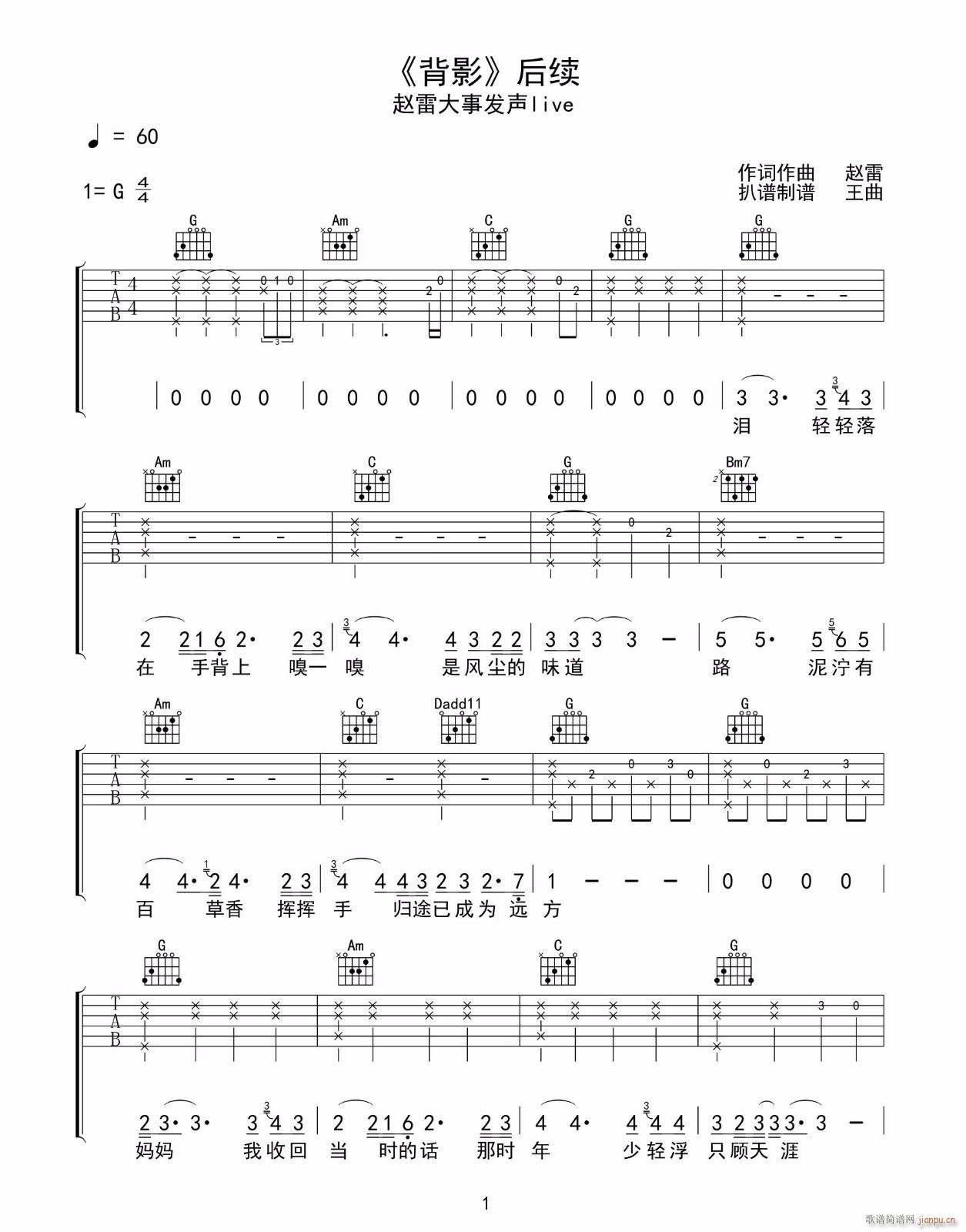 公众号:绵羊乐谱 背影 ( G调指法原版编配) 免费弹唱吉他谱_六线谱/词曲:赵雷 点击: (网络) 公众号:绵羊乐谱 | 官方QQ群:978773290 不吃独食,学会分享!本文链接:http://www.shaomingyang.com/btb/33766.html 转载请标明出处,尊重原创(๑╹◡╹)ノ。如信息有误或版权疑问,请通过网站底部联系我们会第一时间处理,感谢理解支持(◕ᴗ◕✿)!
