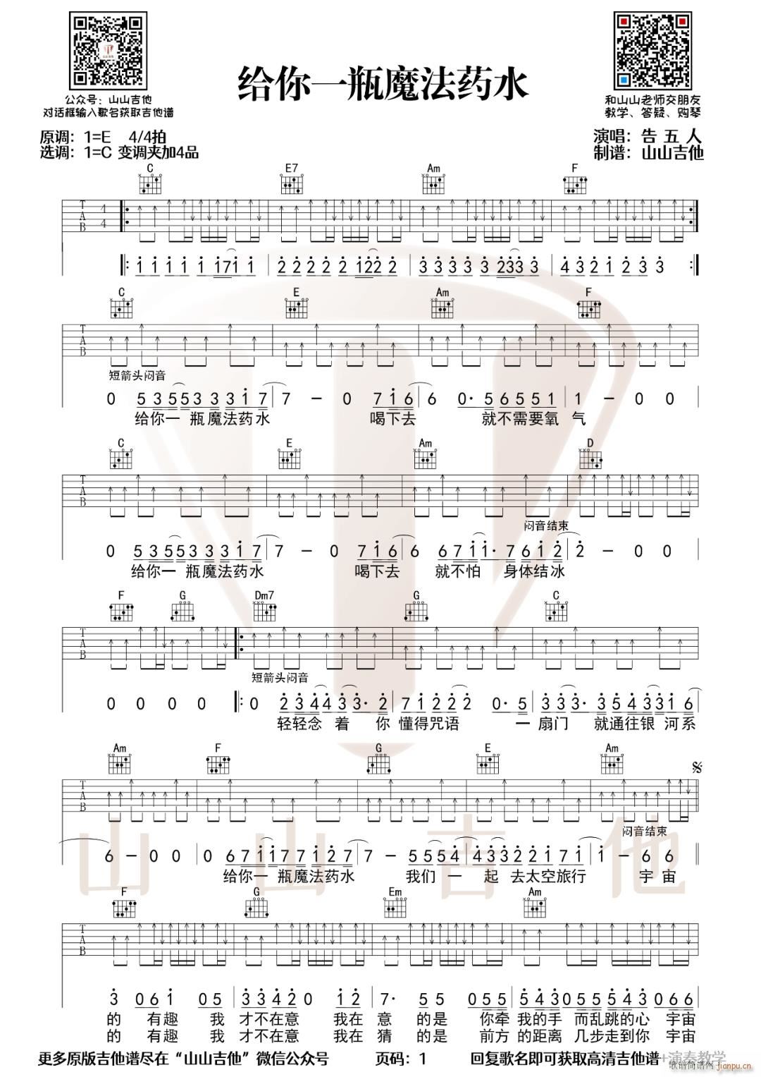 公众号:绵羊乐谱 给你一杯魔法药水 ( C调扫弦版) 免费弹唱吉他谱_六线谱/词曲:告五人 点击: (山山吉他) 公众号:绵羊乐谱 | 官方QQ群:978773290 不吃独食,学会分享!本文链接:http://www.shaomingyang.com/btb/33797.html 转载请标明出处,尊重原创(๑╹◡╹)ノ。如信息有误或版权疑问,请通过网站底部联系我们会第一时间处理,感谢理解支持(◕ᴗ◕✿)!