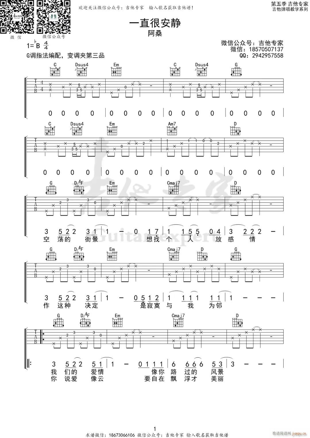 公众号:绵羊乐谱 一直很安静 ( G调指法编配) 免费弹唱吉他谱_六线谱/词曲:阿桑 点击: (吉他专家) 公众号:绵羊乐谱 | 官方QQ群:978773290 不吃独食,学会分享!本文链接:http://www.shaomingyang.com/btb/33976.html 转载请标明出处,尊重原创(๑╹◡╹)ノ。如信息有误或版权疑问,请通过网站底部联系我们会第一时间处理,感谢理解支持(◕ᴗ◕✿)!