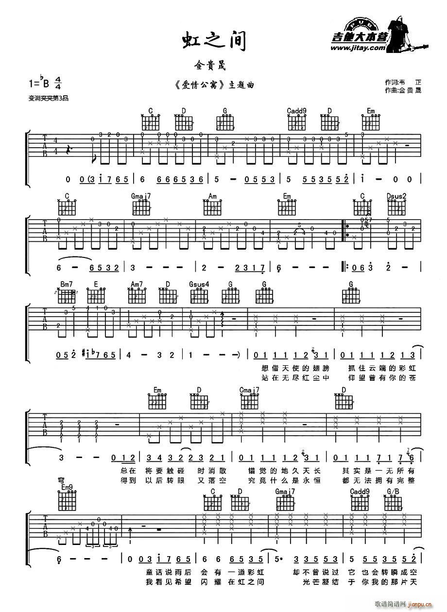 公众号:绵羊乐谱 虹之间(《?爱情公寓4》主题曲》)免费弹唱吉他谱_六线谱/词曲:金贵晟 点击: 1000 图片可能经过缩放,手机长按或点开后长按保存,电脑鼠标右键保存. (车里子) 公众号:绵羊乐谱 | 官方QQ群:978773290 不吃独食,学会分享!本文链接:http://www.shaomingyang.com/btb/33980.html 转载请标明出处,尊重原创(๑╹◡╹)ノ。如信息有误或版权疑问,请通过网站底部联系我们会第一时间处理,感谢理解支持(◕ᴗ◕✿)!
