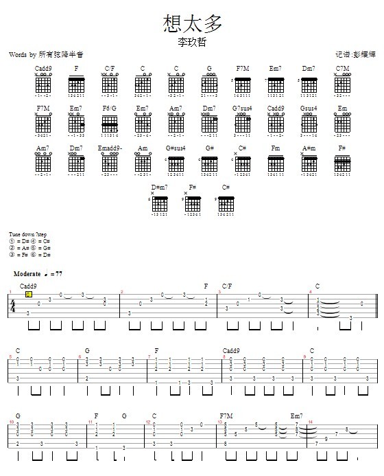 公众号:绵羊乐谱 想太多—李玖哲免费弹唱吉他谱_六线谱: 点击: 1000 图片可能经过缩放,手机长按或点开后长按保存,电脑鼠标右键保存. (乐友pyhxwghgn传谱) 公众号:绵羊乐谱 | 官方QQ群:978773290 不吃独食,学会分享!本文链接:http://www.shaomingyang.com/btb/34275.html 转载请标明出处,尊重原创(๑╹◡╹)ノ。如信息有误或版权疑问,请通过网站底部联系我们会第一时间处理,感谢理解支持(◕ᴗ◕✿)!