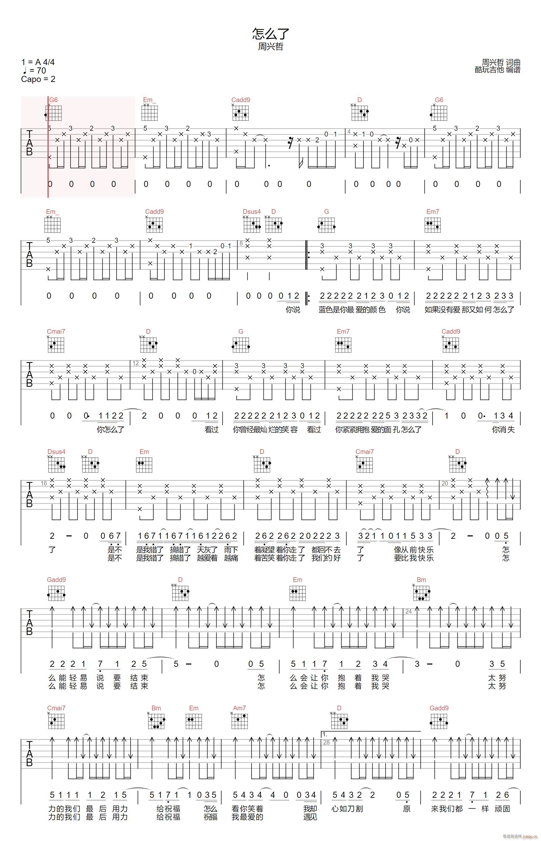 公众号:绵羊乐谱 怎么了 ( G调原版编配)免费弹唱吉他谱_六线谱/词曲:周兴哲 点击: 1000 图片可能经过缩放,手机长按或点开后长按保存,电脑鼠标右键保存. (酷玩吉他) 公众号:绵羊乐谱 | 官方QQ群:978773290 不吃独食,学会分享!本文链接:http://www.shaomingyang.com/btb/34444.html 转载请标明出处,尊重原创(๑╹◡╹)ノ。如信息有误或版权疑问,请通过网站底部联系我们会第一时间处理,感谢理解支持(◕ᴗ◕✿)!