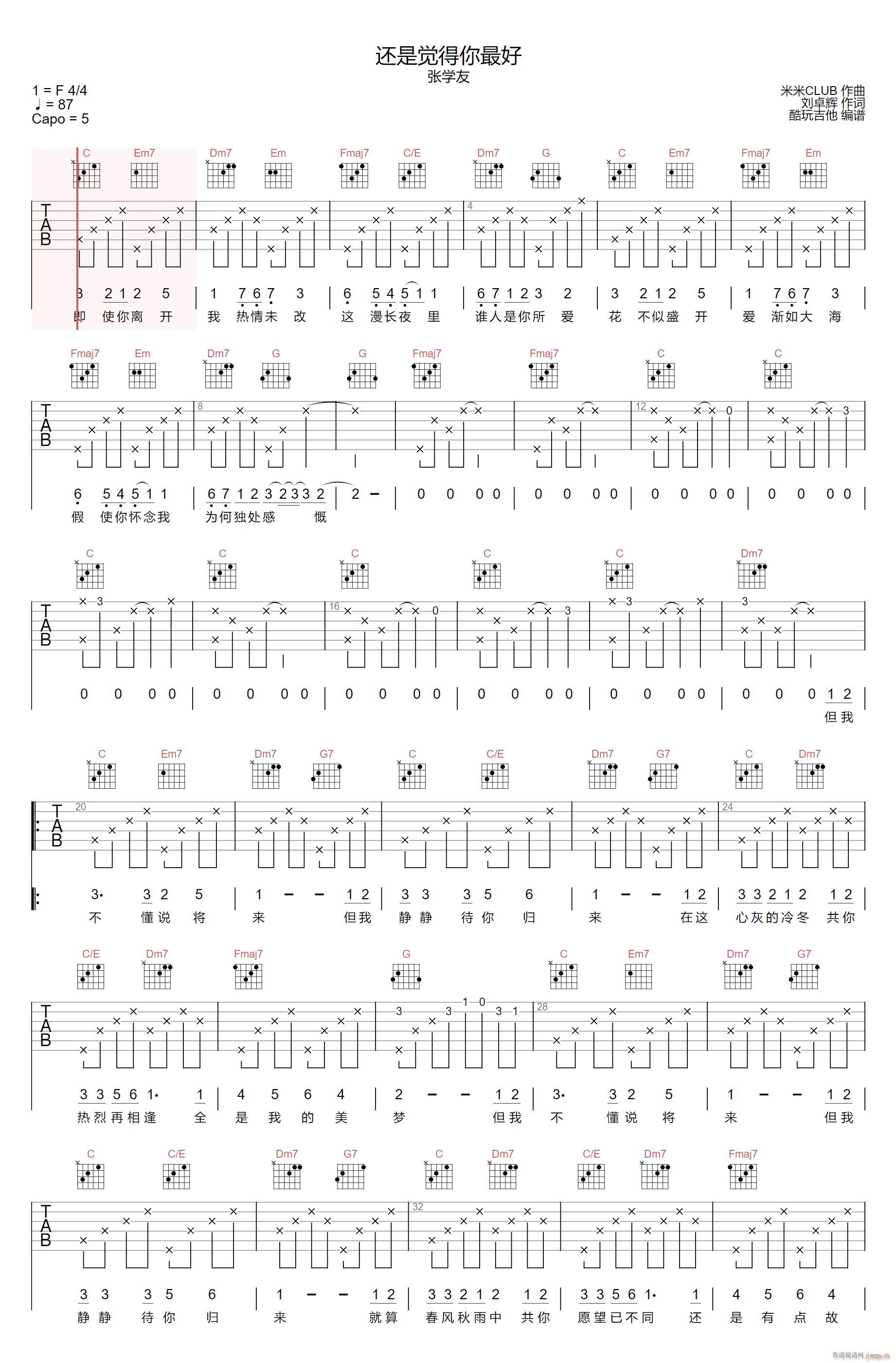 公众号:绵羊乐谱 还是觉得你最好 ( C调指法) 免费弹唱吉他谱_六线谱/词曲:张学友 点击: (酷玩吉他) 公众号:绵羊乐谱 | 官方QQ群:978773290 不吃独食,学会分享!本文链接:http://www.shaomingyang.com/btb/34452.html 转载请标明出处,尊重原创(๑╹◡╹)ノ。如信息有误或版权疑问,请通过网站底部联系我们会第一时间处理,感谢理解支持(◕ᴗ◕✿)!