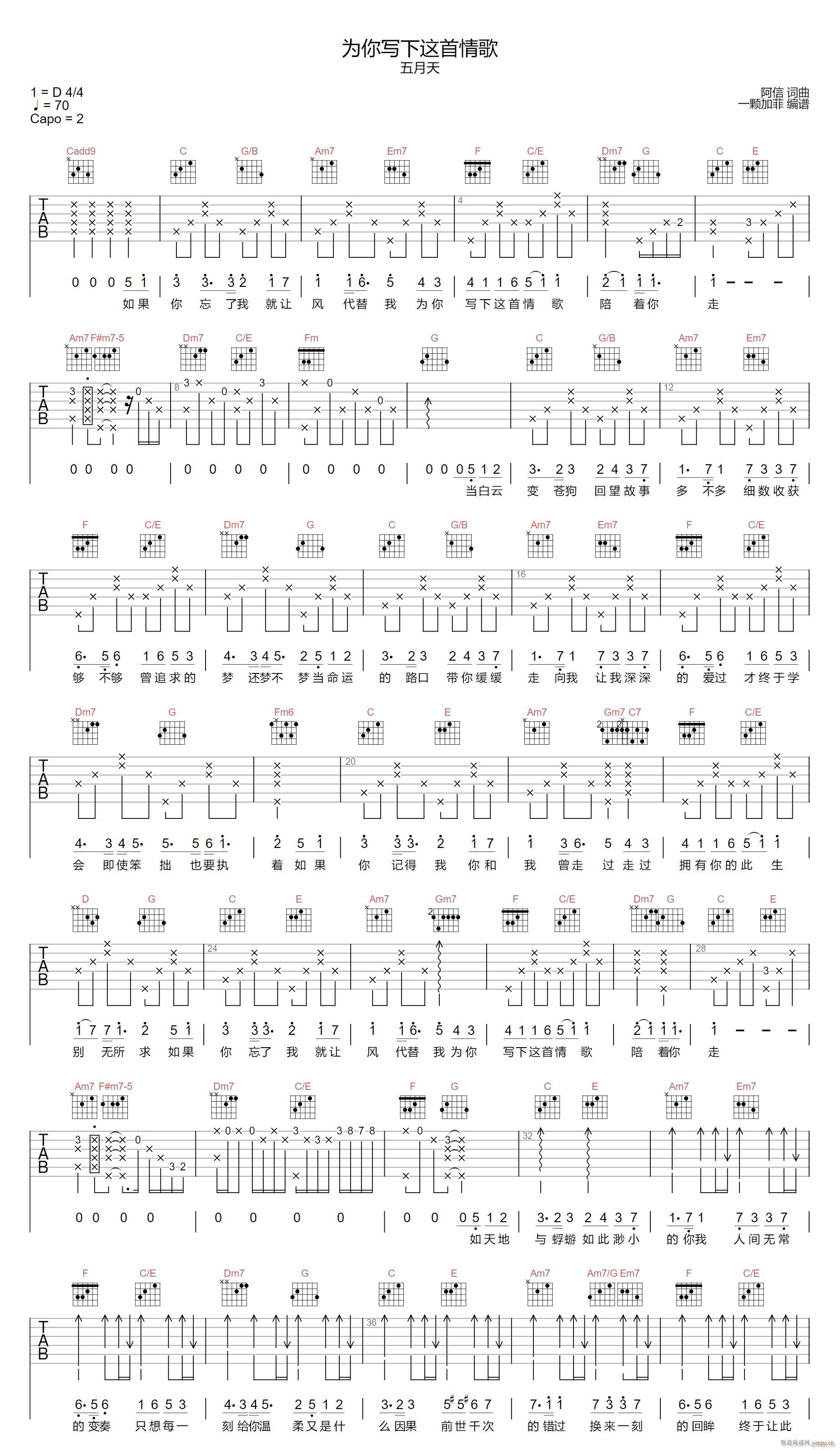 公众号:绵羊乐谱 为你写下这首情歌 ( C调指法) 免费弹唱吉他谱_六线谱/词曲:五月天 点击: (一颗加菲) 公众号:绵羊乐谱 | 官方QQ群:978773290 不吃独食,学会分享!本文链接:http://www.shaomingyang.com/btb/34478.html 转载请标明出处,尊重原创(๑╹◡╹)ノ。如信息有误或版权疑问,请通过网站底部联系我们会第一时间处理,感谢理解支持(◕ᴗ◕✿)!