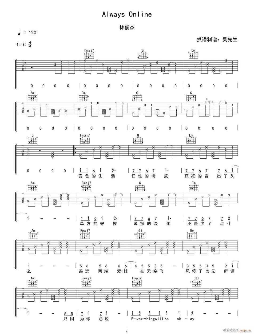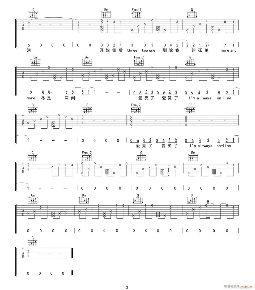 公众号:绵羊乐谱 Always-Online ( C调原版编配) 免费弹唱吉他谱_六线谱/词曲:林俊杰 点击: (网络) 公众号:绵羊乐谱 | 官方QQ群:978773290 不吃独食,学会分享!本文链接:http://www.shaomingyang.com/btb/34490.html 转载请标明出处,尊重原创(๑╹◡╹)ノ。如信息有误或版权疑问,请通过网站底部联系我们会第一时间处理,感谢理解支持(◕ᴗ◕✿)!