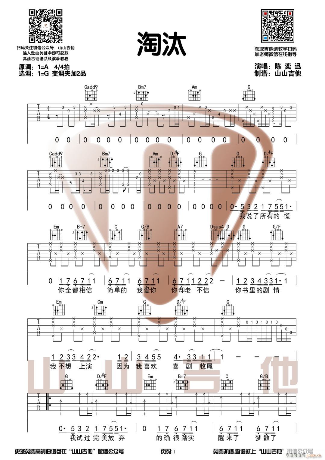 公众号:绵羊乐谱 淘汰 ( G调指法原版编配) 免费弹唱吉他谱_六线谱/词曲:陈奕迅 点击: (山山吉他) 公众号:绵羊乐谱 | 官方QQ群:978773290 不吃独食,学会分享!本文链接:http://www.shaomingyang.com/btb/34494.html 转载请标明出处,尊重原创(๑╹◡╹)ノ。如信息有误或版权疑问,请通过网站底部联系我们会第一时间处理,感谢理解支持(◕ᴗ◕✿)!