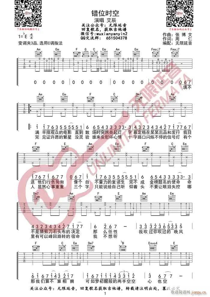 公众号:绵羊乐谱 错位时空 ( C调原版编配) 免费弹唱吉他谱_六线谱/词曲:艾辰 点击: (无限延音) 公众号:绵羊乐谱 | 官方QQ群:978773290 不吃独食,学会分享!本文链接:http://www.shaomingyang.com/btb/34496.html 转载请标明出处,尊重原创(๑╹◡╹)ノ。如信息有误或版权疑问,请通过网站底部联系我们会第一时间处理,感谢理解支持(◕ᴗ◕✿)!