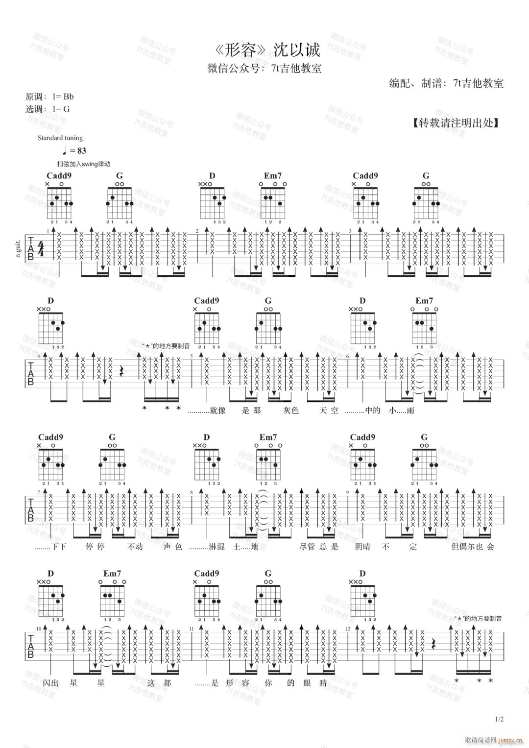 公众号:绵羊乐谱 形容 ( G调扫弦版) 免费弹唱吉他谱_六线谱/词曲:沈以诚 点击: (网络) 公众号:绵羊乐谱 | 官方QQ群:978773290 不吃独食,学会分享!本文链接:http://www.shaomingyang.com/btb/34509.html 转载请标明出处,尊重原创(๑╹◡╹)ノ。如信息有误或版权疑问,请通过网站底部联系我们会第一时间处理,感谢理解支持(◕ᴗ◕✿)!