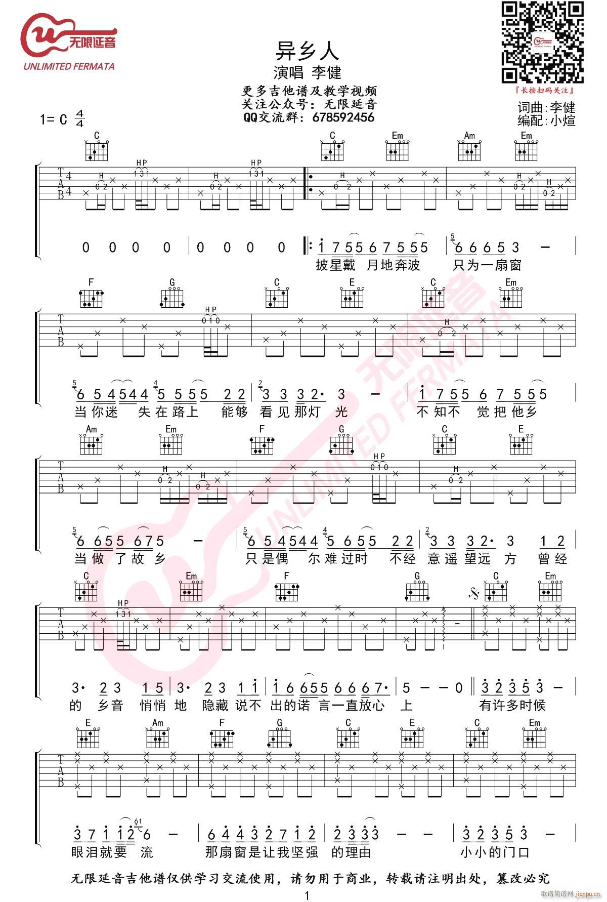 公众号:绵羊乐谱 异乡人 ( C调指法原版编配) 免费弹唱吉他谱_六线谱/词曲:李健 点击: (无限延音) 公众号:绵羊乐谱 | 官方QQ群:978773290 不吃独食,学会分享!本文链接:http://www.shaomingyang.com/btb/34516.html 转载请标明出处,尊重原创(๑╹◡╹)ノ。如信息有误或版权疑问,请通过网站底部联系我们会第一时间处理,感谢理解支持(◕ᴗ◕✿)!