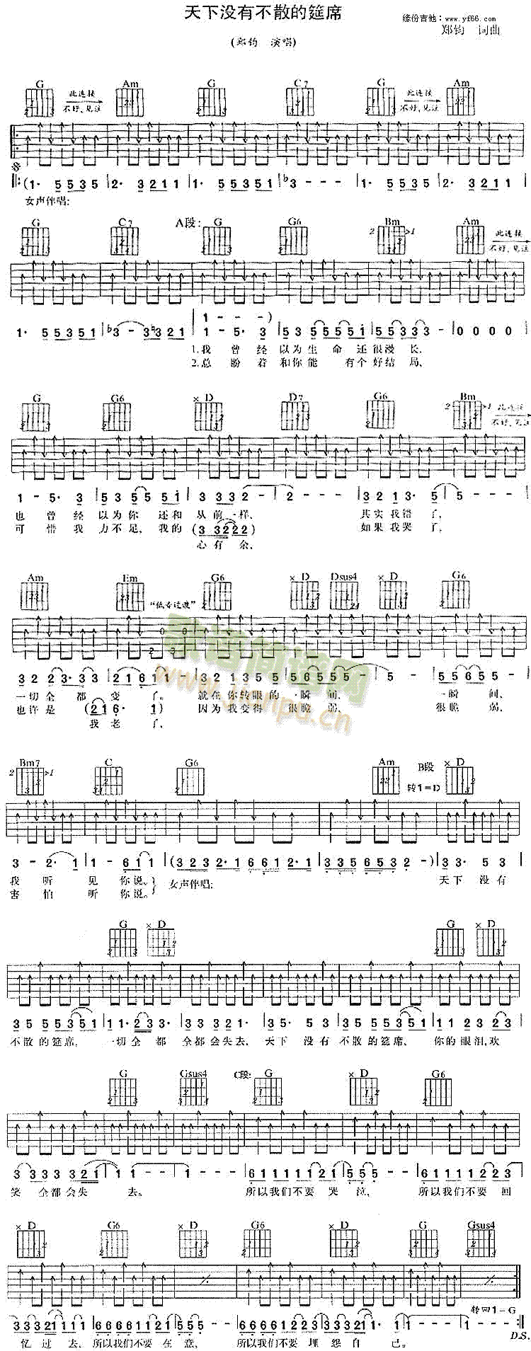 公众号:绵羊乐谱 天下没有不散的宴席免费弹唱吉他谱_六线谱:郑钧 点击: 1000 图片可能经过缩放,手机长按或点开后长按保存,电脑鼠标右键保存. (网络) 公众号:绵羊乐谱 | 官方QQ群:978773290 不吃独食,学会分享!本文链接:http://www.shaomingyang.com/btb/34519.html 转载请标明出处,尊重原创(๑╹◡╹)ノ。如信息有误或版权疑问,请通过网站底部联系我们会第一时间处理,感谢理解支持(◕ᴗ◕✿)!
