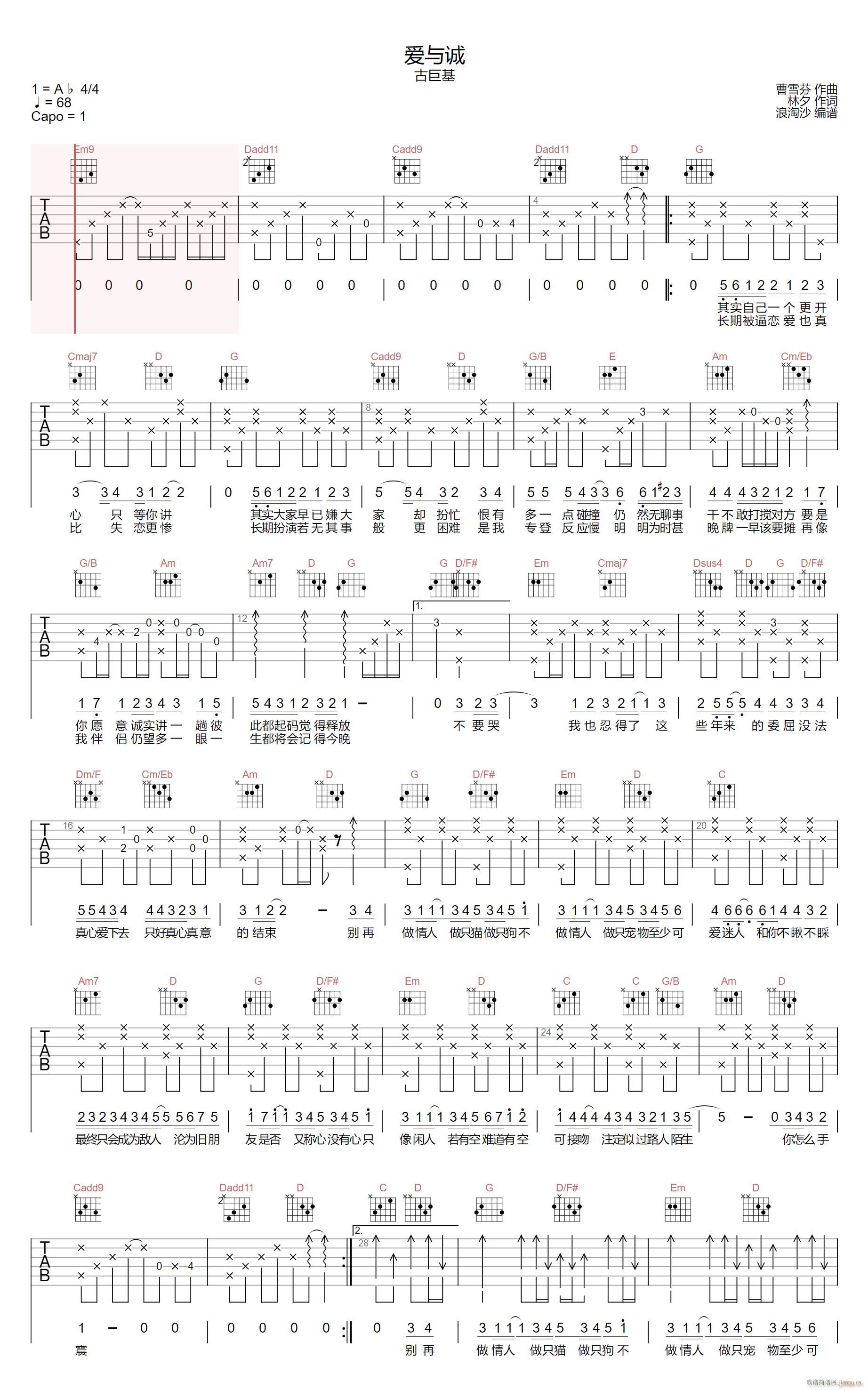 公众号:绵羊乐谱 爱与诚 ( G调原版编配) 免费弹唱吉他谱_六线谱/词曲:古巨基 点击: (浪淘沙) 公众号:绵羊乐谱 | 官方QQ群:978773290 不吃独食,学会分享!本文链接:http://www.shaomingyang.com/btb/34587.html 转载请标明出处,尊重原创(๑╹◡╹)ノ。如信息有误或版权疑问,请通过网站底部联系我们会第一时间处理,感谢理解支持(◕ᴗ◕✿)!