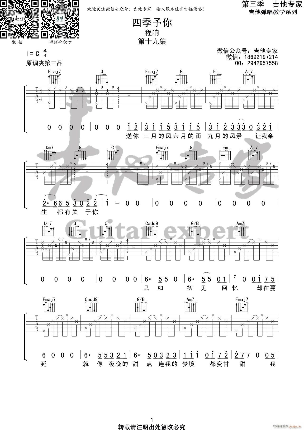 公众号:绵羊乐谱 四季予你 ( C调指法原版编配) 免费弹唱吉他谱_六线谱/词曲:程响 点击: (吉他专家) 公众号:绵羊乐谱 | 官方QQ群:978773290 不吃独食,学会分享!本文链接:http://www.shaomingyang.com/btb/34597.html 转载请标明出处,尊重原创(๑╹◡╹)ノ。如信息有误或版权疑问,请通过网站底部联系我们会第一时间处理,感谢理解支持(◕ᴗ◕✿)!