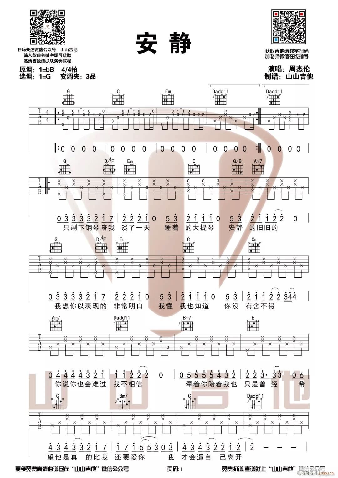 公众号:绵羊乐谱 安静 ( G调原版编配) 免费弹唱吉他谱_六线谱/词曲:周杰伦 点击: (山山吉他) 公众号:绵羊乐谱 | 官方QQ群:978773290 不吃独食,学会分享!本文链接:http://www.shaomingyang.com/btb/34707.html 转载请标明出处,尊重原创(๑╹◡╹)ノ。如信息有误或版权疑问,请通过网站底部联系我们会第一时间处理,感谢理解支持(◕ᴗ◕✿)!