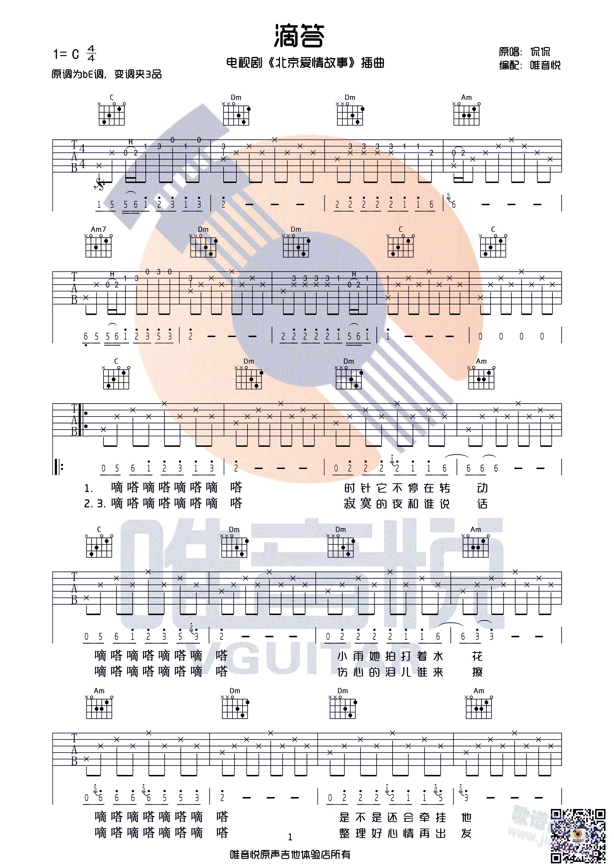 滴答免费弹唱吉他谱_六线谱/词曲:侃侃要高清谱的童鞋 可以关注微信或微博:唯音悦吉他社 也可以加 (备注:吉他谱) 我们还会继续更多精品谱与教学视频给大家的 最近开始出教学视频 不懂的童鞋可以看我们的视频哦 关注我们的优酷频道,搜索唯音悦,即可观看视频!点击: 1000 图片可能经过缩放,手机长按或点开后长按保存,电脑鼠标右键保存.