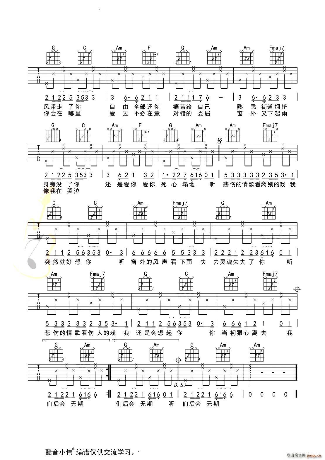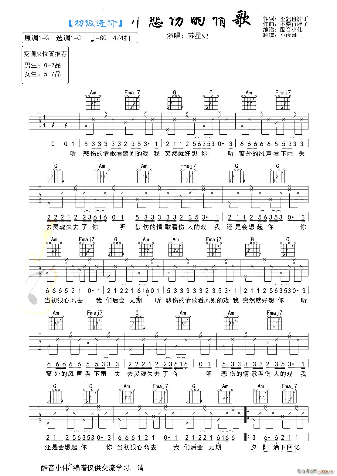 公众号:绵羊乐谱 听悲伤的情歌 新手初级进阶版 免费弹唱吉他谱_六线谱/词曲:苏星婕 点击: (酷音小伟) 公众号:绵羊乐谱 | 官方QQ群:978773290 不吃独食,学会分享!本文链接:http://www.shaomingyang.com/btb/34728.html 转载请标明出处,尊重原创(๑╹◡╹)ノ。如信息有误或版权疑问,请通过网站底部联系我们会第一时间处理,感谢理解支持(◕ᴗ◕✿)!