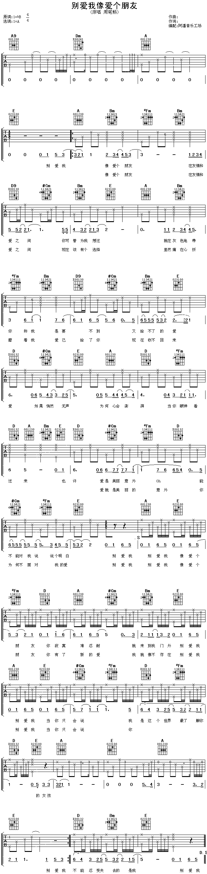 公众号:绵羊乐谱 别爱我想爱个朋友免费弹唱吉他谱_六线谱:周笔畅 点击: 1000 图片可能经过缩放,手机长按或点开后长按保存,电脑鼠标右键保存. (网络) 公众号:绵羊乐谱 | 官方QQ群:978773290 不吃独食,学会分享!本文链接:http://www.shaomingyang.com/btb/34732.html 转载请标明出处,尊重原创(๑╹◡╹)ノ。如信息有误或版权疑问,请通过网站底部联系我们会第一时间处理,感谢理解支持(◕ᴗ◕✿)!