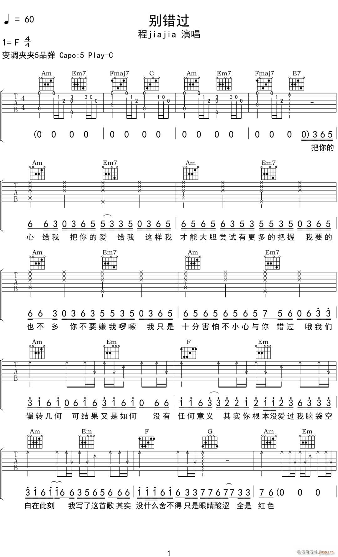 公众号:绵羊乐谱 别错过 ( C调原版编配) 免费弹唱吉他谱_六线谱/词曲:程jiajia 点击: (网络) 公众号:绵羊乐谱 | 官方QQ群:978773290 不吃独食,学会分享!本文链接:http://www.shaomingyang.com/btb/34795.html 转载请标明出处,尊重原创(๑╹◡╹)ノ。如信息有误或版权疑问,请通过网站底部联系我们会第一时间处理,感谢理解支持(◕ᴗ◕✿)!