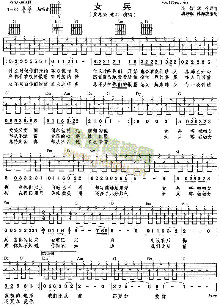 公众号:绵羊乐谱 女兵(黄志坚、老兵)免费弹唱吉他谱_六线谱:未知 点击: 1000 图片可能经过缩放,手机长按或点开后长按保存,电脑鼠标右键保存. (网络) 公众号:绵羊乐谱 | 官方QQ群:978773290 不吃独食,学会分享!本文链接:http://www.shaomingyang.com/btb/34871.html 转载请标明出处,尊重原创(๑╹◡╹)ノ。如信息有误或版权疑问,请通过网站底部联系我们会第一时间处理,感谢理解支持(◕ᴗ◕✿)!