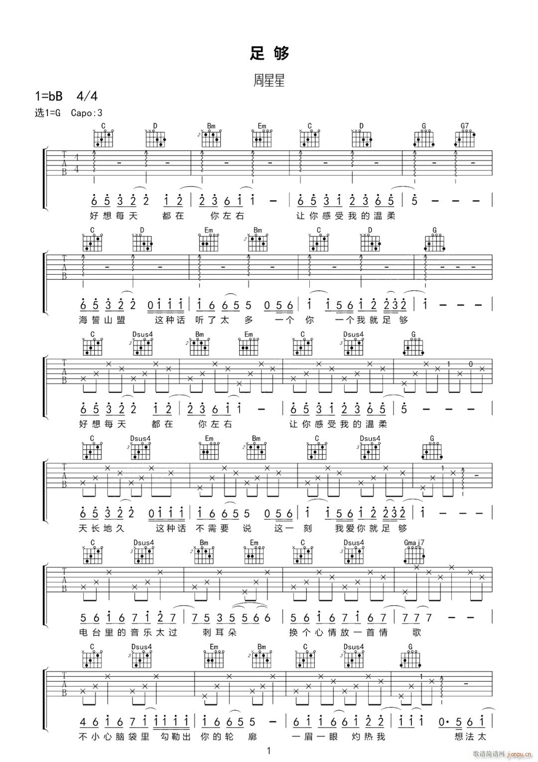 公众号:绵羊乐谱 足够 ( G调指法原版编配) 免费弹唱吉他谱_六线谱/词曲:周星星 点击: (网络) 公众号:绵羊乐谱 | 官方QQ群:978773290 不吃独食,学会分享!本文链接:http://www.shaomingyang.com/btb/34875.html 转载请标明出处,尊重原创(๑╹◡╹)ノ。如信息有误或版权疑问,请通过网站底部联系我们会第一时间处理,感谢理解支持(◕ᴗ◕✿)!