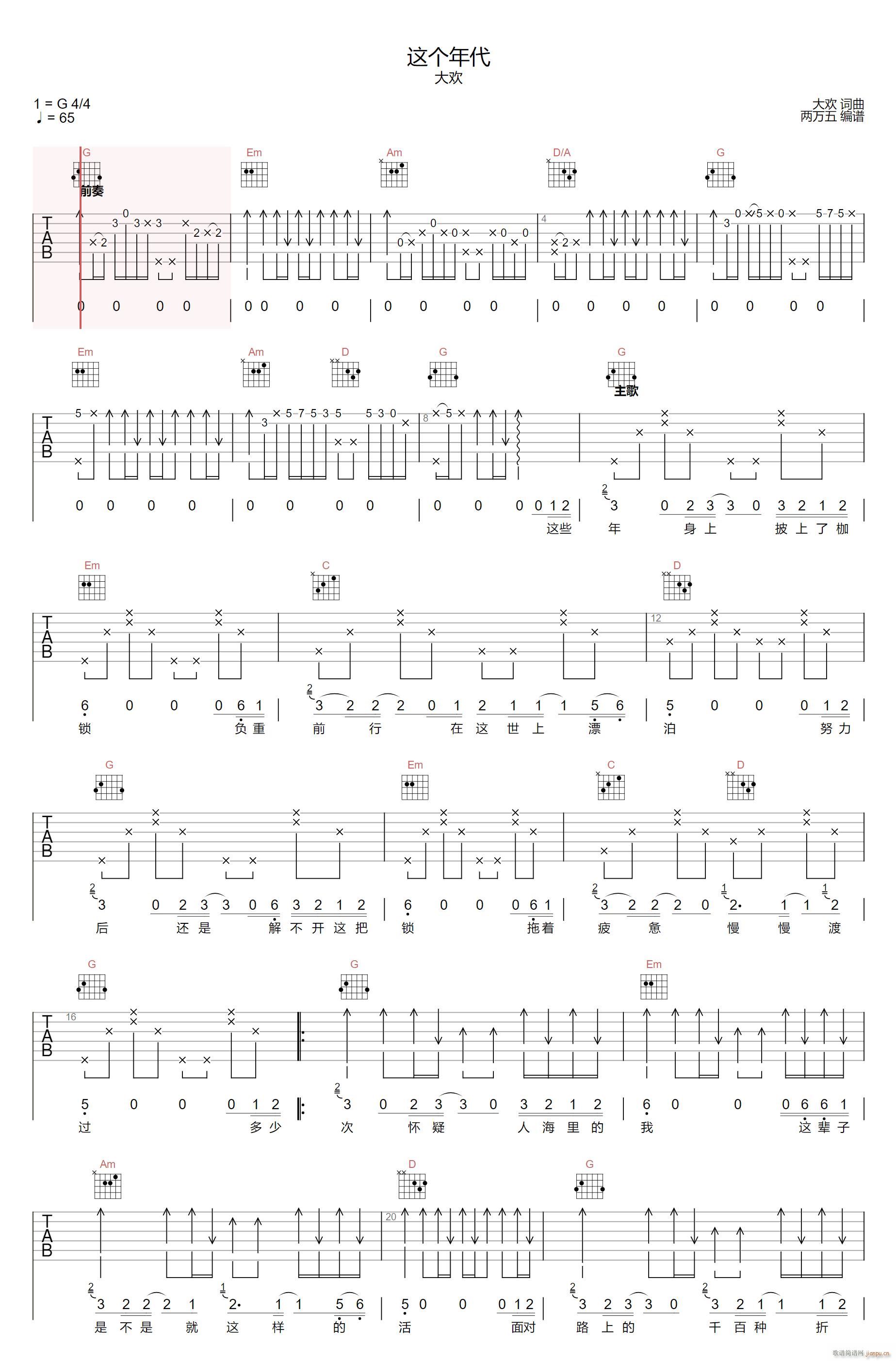 公众号:绵羊乐谱 这个年代 ( G调指法原版编配) 免费弹唱吉他谱_六线谱/词曲:大欢 点击: (两万五) 公众号:绵羊乐谱 | 官方QQ群:978773290 不吃独食,学会分享!本文链接:http://www.shaomingyang.com/btb/34879.html 转载请标明出处,尊重原创(๑╹◡╹)ノ。如信息有误或版权疑问,请通过网站底部联系我们会第一时间处理,感谢理解支持(◕ᴗ◕✿)!