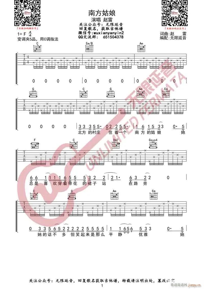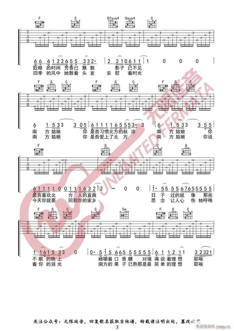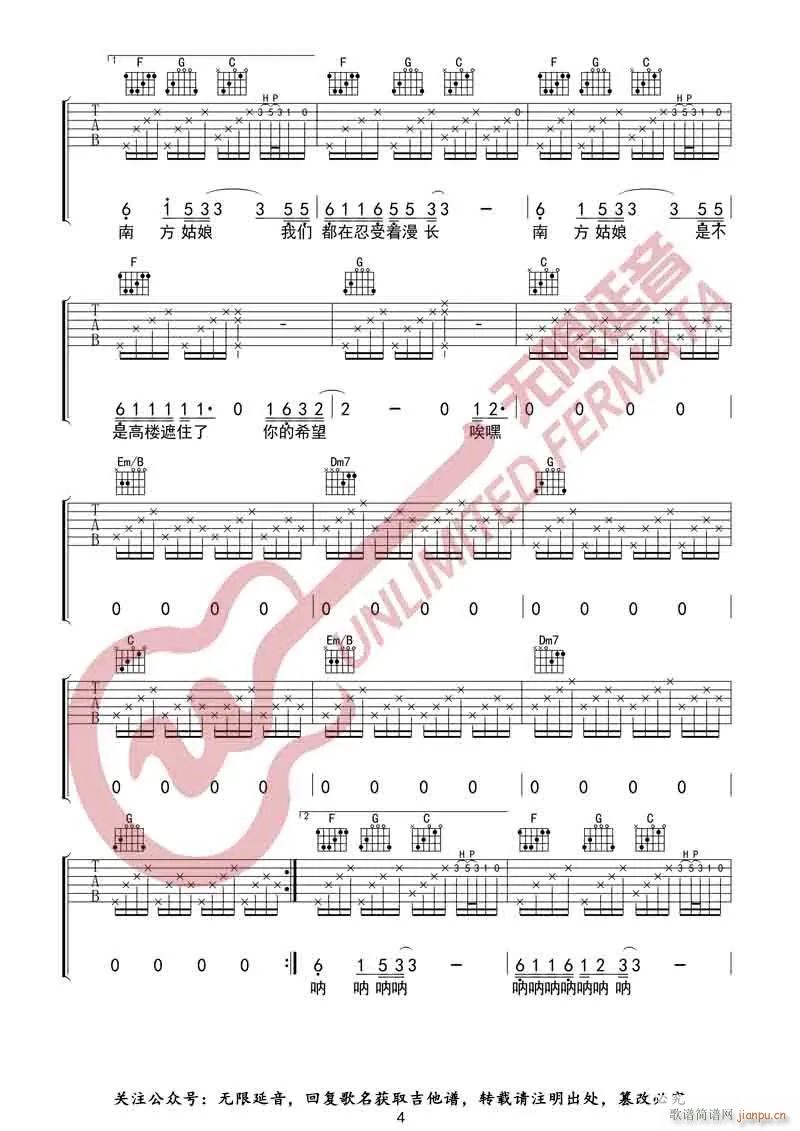 公众号:绵羊乐谱 南方姑娘 ( C调原版编配)免费弹唱吉他谱_六线谱/词曲:赵雷 点击: 1000 图片可能经过缩放,手机长按或点开后长按保存,电脑鼠标右键保存. (无限延音) 公众号:绵羊乐谱 | 官方QQ群:978773290 不吃独食,学会分享!本文链接:http://www.shaomingyang.com/btb/34883.html 转载请标明出处,尊重原创(๑╹◡╹)ノ。如信息有误或版权疑问,请通过网站底部联系我们会第一时间处理,感谢理解支持(◕ᴗ◕✿)!