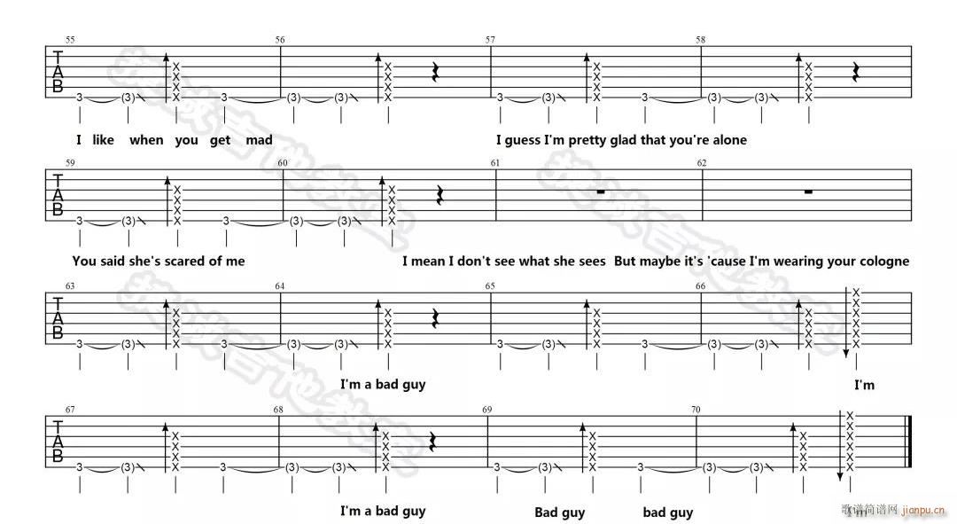 公众号:绵羊乐谱 Bad-Guy ( 降B调指法) 免费弹唱吉他谱_六线谱/词曲:Billie Eilish 点击: (捷诚吉他教室) 公众号:绵羊乐谱 | 官方QQ群:978773290 不吃独食,学会分享!本文链接:http://www.shaomingyang.com/btb/34913.html 转载请标明出处,尊重原创(๑╹◡╹)ノ。如信息有误或版权疑问,请通过网站底部联系我们会第一时间处理,感谢理解支持(◕ᴗ◕✿)!