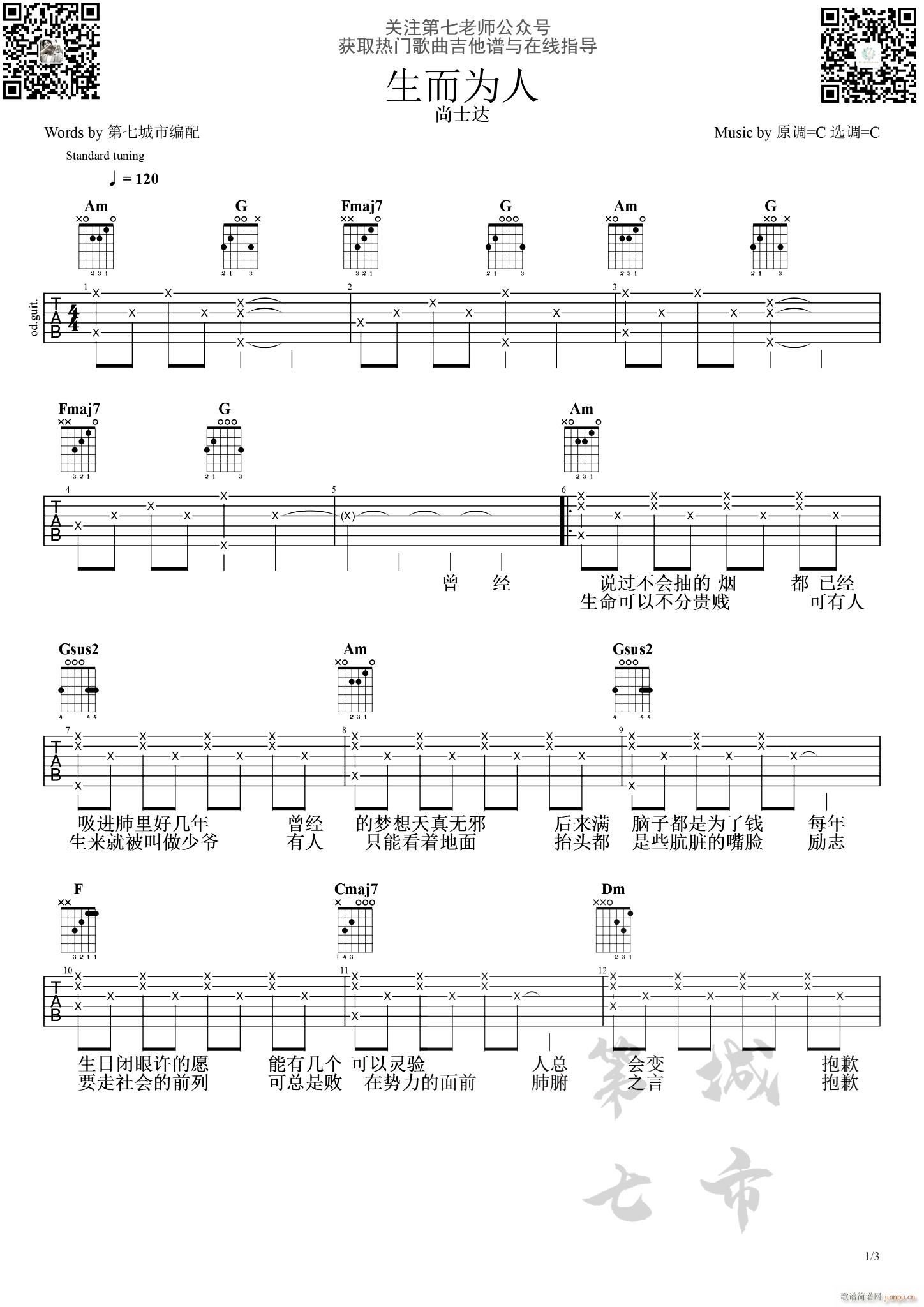 公众号:绵羊乐谱 生而为人 ( C调原版编配) 免费弹唱吉他谱_六线谱/词曲:尚士达 点击: (第七城市) 公众号:绵羊乐谱 | 官方QQ群:978773290 不吃独食,学会分享!本文链接:http://www.shaomingyang.com/btb/34958.html 转载请标明出处,尊重原创(๑╹◡╹)ノ。如信息有误或版权疑问,请通过网站底部联系我们会第一时间处理,感谢理解支持(◕ᴗ◕✿)!