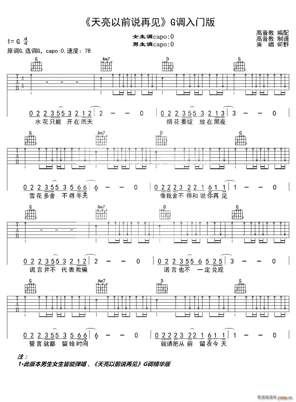 公众号:绵羊乐谱 《天亮以前说再见》 G调入门版 高音教编配免费弹唱吉他谱_六线谱/词曲: 点击: 1000 图片可能经过缩放,手机长按或点开后长按保存,电脑鼠标右键保存. (车里子) 公众号:绵羊乐谱 | 官方QQ群:978773290 不吃独食,学会分享!本文链接:http://www.shaomingyang.com/btb/34970.html 转载请标明出处,尊重原创(๑╹◡╹)ノ。如信息有误或版权疑问,请通过网站底部联系我们会第一时间处理,感谢理解支持(◕ᴗ◕✿)!