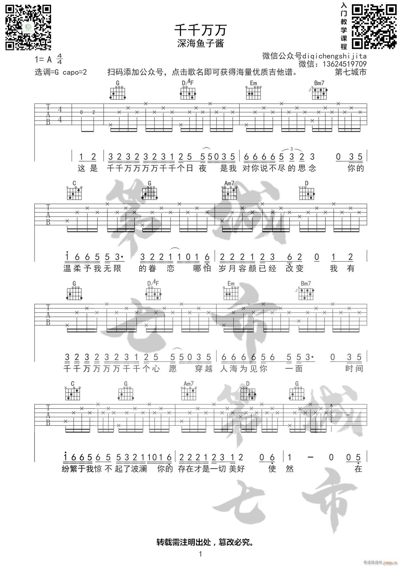 公众号:绵羊乐谱 千千万万 ( G调简单版) 免费弹唱吉他谱_六线谱/词曲:深海鱼子酱 点击: (第七城市) 公众号:绵羊乐谱 | 官方QQ群:978773290 不吃独食,学会分享!本文链接:http://www.shaomingyang.com/btb/35024.html 转载请标明出处,尊重原创(๑╹◡╹)ノ。如信息有误或版权疑问,请通过网站底部联系我们会第一时间处理,感谢理解支持(◕ᴗ◕✿)!