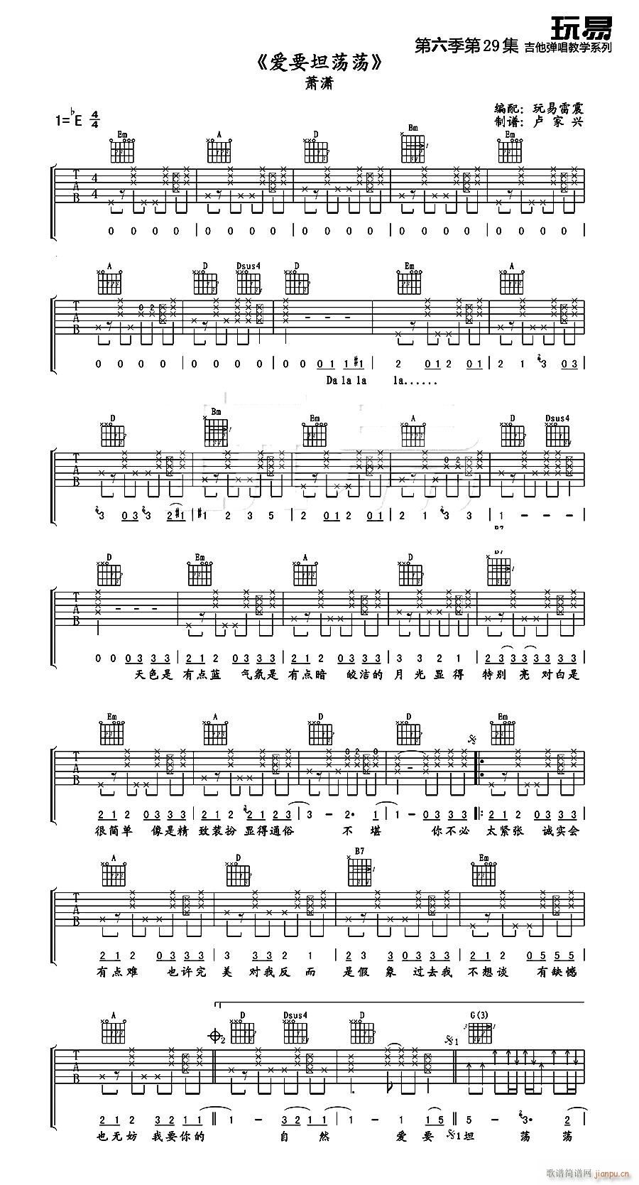 公众号:绵羊乐谱 爱要坦荡荡 ( D调原版编配) 免费弹唱吉他谱_六线谱/词曲:萧潇 点击: (玩易吉他) 公众号:绵羊乐谱 | 官方QQ群:978773290 不吃独食,学会分享!本文链接:http://www.shaomingyang.com/btb/35026.html 转载请标明出处,尊重原创(๑╹◡╹)ノ。如信息有误或版权疑问,请通过网站底部联系我们会第一时间处理,感谢理解支持(◕ᴗ◕✿)!