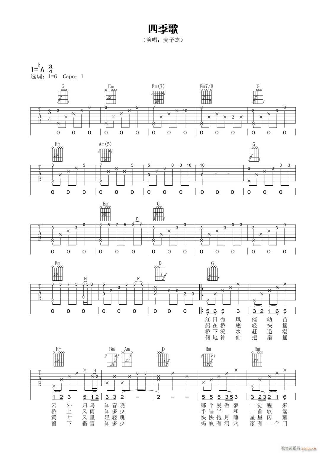 公众号:绵羊乐谱 四季歌 ( 麦子杰 G调原版) 免费弹唱吉他谱_六线谱/词曲:达明一派 点击: (网络) 公众号:绵羊乐谱 | 官方QQ群:978773290 不吃独食,学会分享!本文链接:http://www.shaomingyang.com/btb/35107.html 转载请标明出处,尊重原创(๑╹◡╹)ノ。如信息有误或版权疑问,请通过网站底部联系我们会第一时间处理,感谢理解支持(◕ᴗ◕✿)!