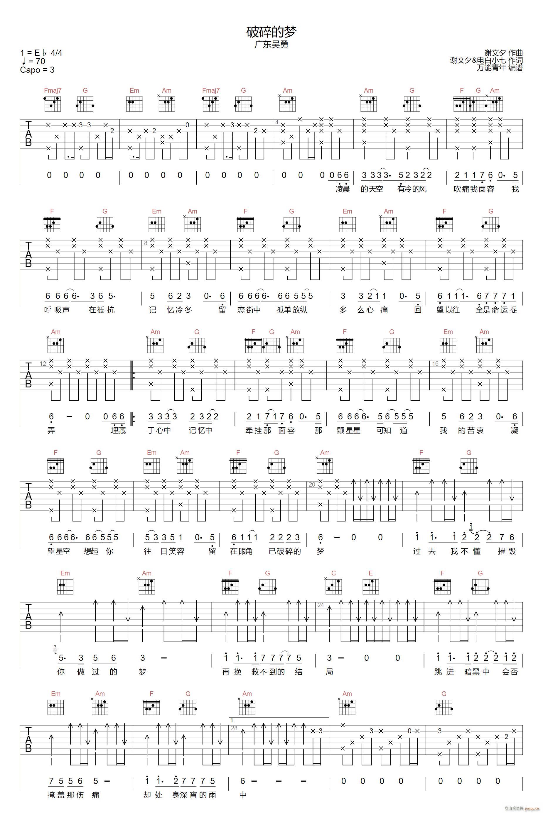 公众号:绵羊乐谱 破碎的梦 ( C调原版编配) 免费弹唱吉他谱_六线谱/词曲:广东吴勇 点击: (万能青年) 公众号:绵羊乐谱 | 官方QQ群:978773290 不吃独食,学会分享!本文链接:http://www.shaomingyang.com/btb/35110.html 转载请标明出处,尊重原创(๑╹◡╹)ノ。如信息有误或版权疑问,请通过网站底部联系我们会第一时间处理,感谢理解支持(◕ᴗ◕✿)!