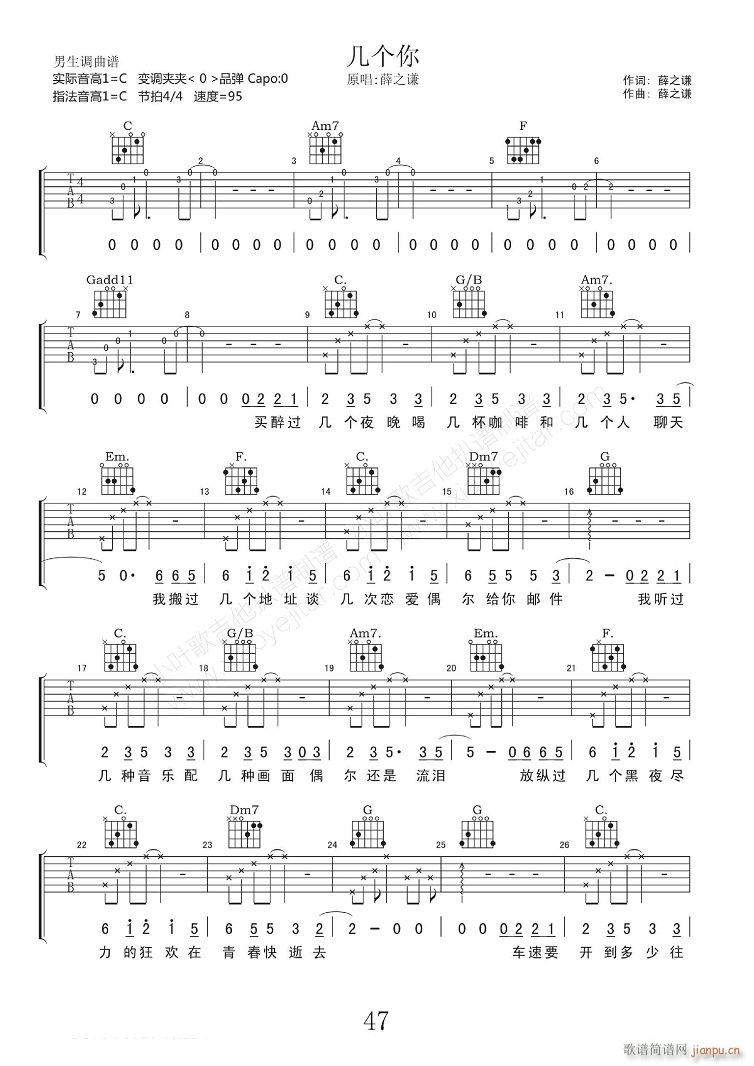 公众号:绵羊乐谱 几个你 ( C调指法原版编配) 免费弹唱吉他谱_六线谱/词曲:薛之谦 点击: (网络) 公众号:绵羊乐谱 | 官方QQ群:978773290 不吃独食,学会分享!本文链接:http://www.shaomingyang.com/btb/35112.html 转载请标明出处,尊重原创(๑╹◡╹)ノ。如信息有误或版权疑问,请通过网站底部联系我们会第一时间处理,感谢理解支持(◕ᴗ◕✿)!