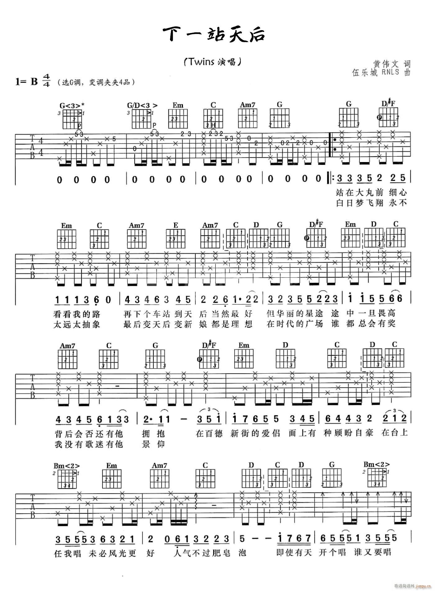 公众号:绵羊乐谱 下一站天后 ( G调原版编配)免费弹唱吉他谱_六线谱/词曲:Twins 点击: 1000 图片可能经过缩放,手机长按或点开后长按保存,电脑鼠标右键保存. (网络) 公众号:绵羊乐谱 | 官方QQ群:978773290 不吃独食,学会分享!本文链接:http://www.shaomingyang.com/btb/35132.html 转载请标明出处,尊重原创(๑╹◡╹)ノ。如信息有误或版权疑问,请通过网站底部联系我们会第一时间处理,感谢理解支持(◕ᴗ◕✿)!