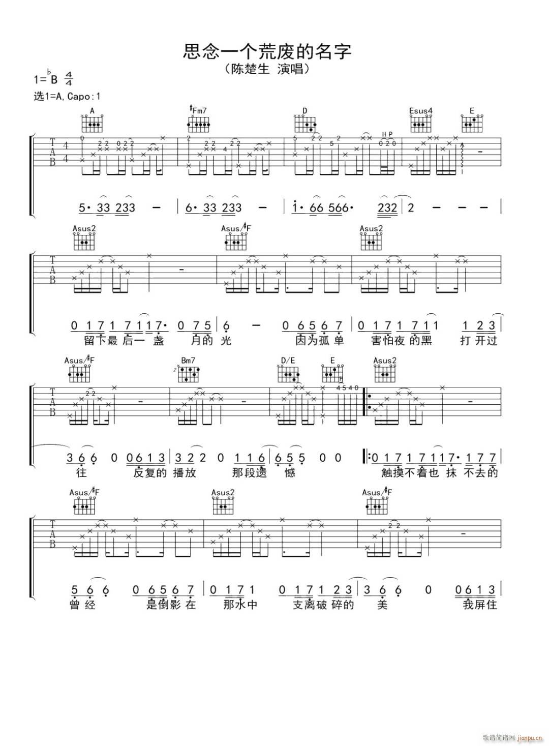 公众号:绵羊乐谱 思念一个荒废的名字 ( A调原版) 免费弹唱吉他谱_六线谱/词曲:陈楚生 点击: (网络) 公众号:绵羊乐谱 | 官方QQ群:978773290 不吃独食,学会分享!本文链接:http://www.shaomingyang.com/btb/35204.html 转载请标明出处,尊重原创(๑╹◡╹)ノ。如信息有误或版权疑问,请通过网站底部联系我们会第一时间处理,感谢理解支持(◕ᴗ◕✿)!