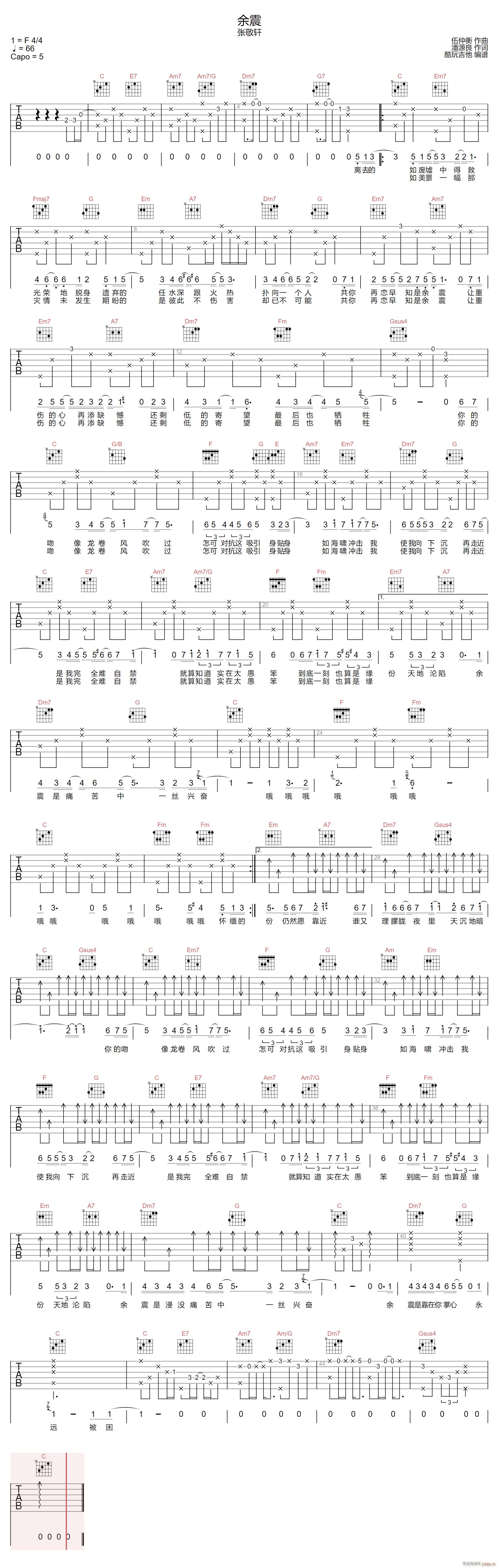 公众号:绵羊乐谱 余震 ( C调指法原版编配) 免费弹唱吉他谱_六线谱/词曲:张敬轩 点击: (酷玩吉他) 公众号:绵羊乐谱 | 官方QQ群:978773290 不吃独食,学会分享!本文链接:http://www.shaomingyang.com/btb/35212.html 转载请标明出处,尊重原创(๑╹◡╹)ノ。如信息有误或版权疑问,请通过网站底部联系我们会第一时间处理,感谢理解支持(◕ᴗ◕✿)!