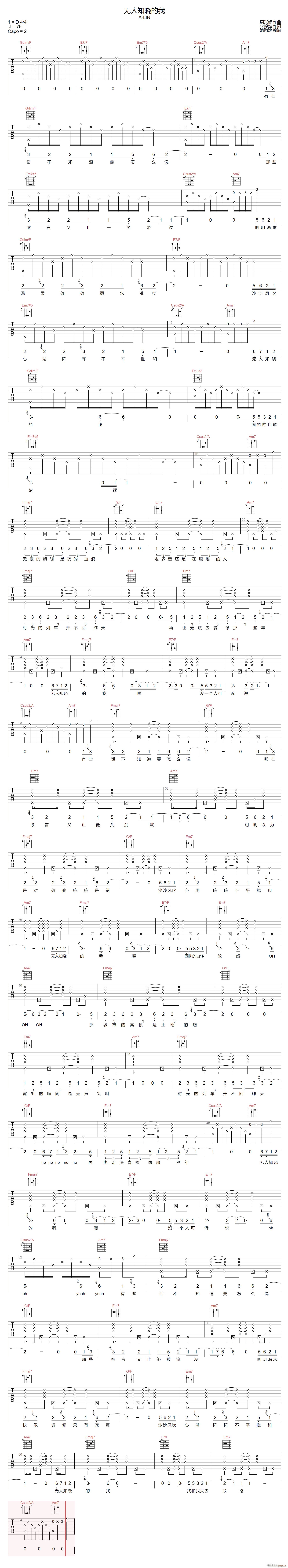 公众号:绵羊乐谱 无人知晓的我 ( C调原版编配) 免费弹唱吉他谱_六线谱/词曲:黄丽玲 点击: (浪淘沙) 公众号:绵羊乐谱 | 官方QQ群:978773290 不吃独食,学会分享!本文链接:http://www.shaomingyang.com/btb/35213.html 转载请标明出处,尊重原创(๑╹◡╹)ノ。如信息有误或版权疑问,请通过网站底部联系我们会第一时间处理,感谢理解支持(◕ᴗ◕✿)!