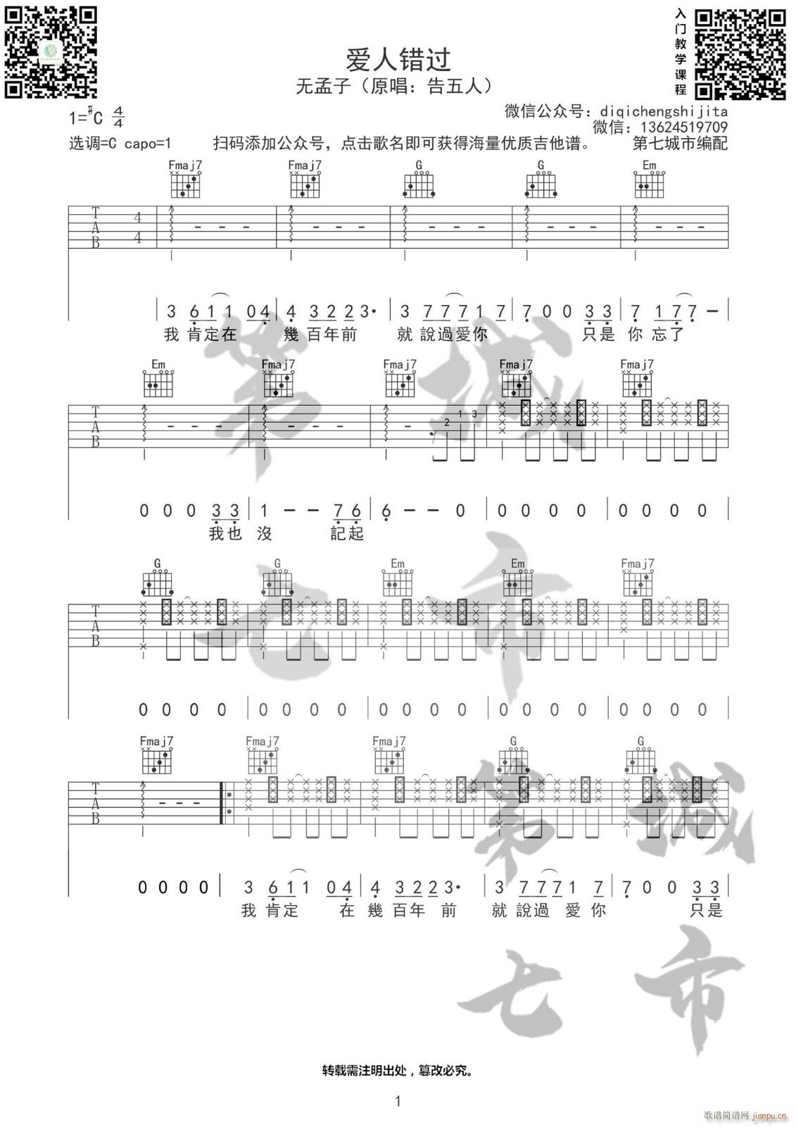 公众号:绵羊乐谱 爱人错过 ( C调指法编配) 免费弹唱吉他谱_六线谱/词曲:无孟子 点击: (第七城市) 公众号:绵羊乐谱 | 官方QQ群:978773290 不吃独食,学会分享!本文链接:http://www.shaomingyang.com/btb/35217.html 转载请标明出处,尊重原创(๑╹◡╹)ノ。如信息有误或版权疑问,请通过网站底部联系我们会第一时间处理,感谢理解支持(◕ᴗ◕✿)!