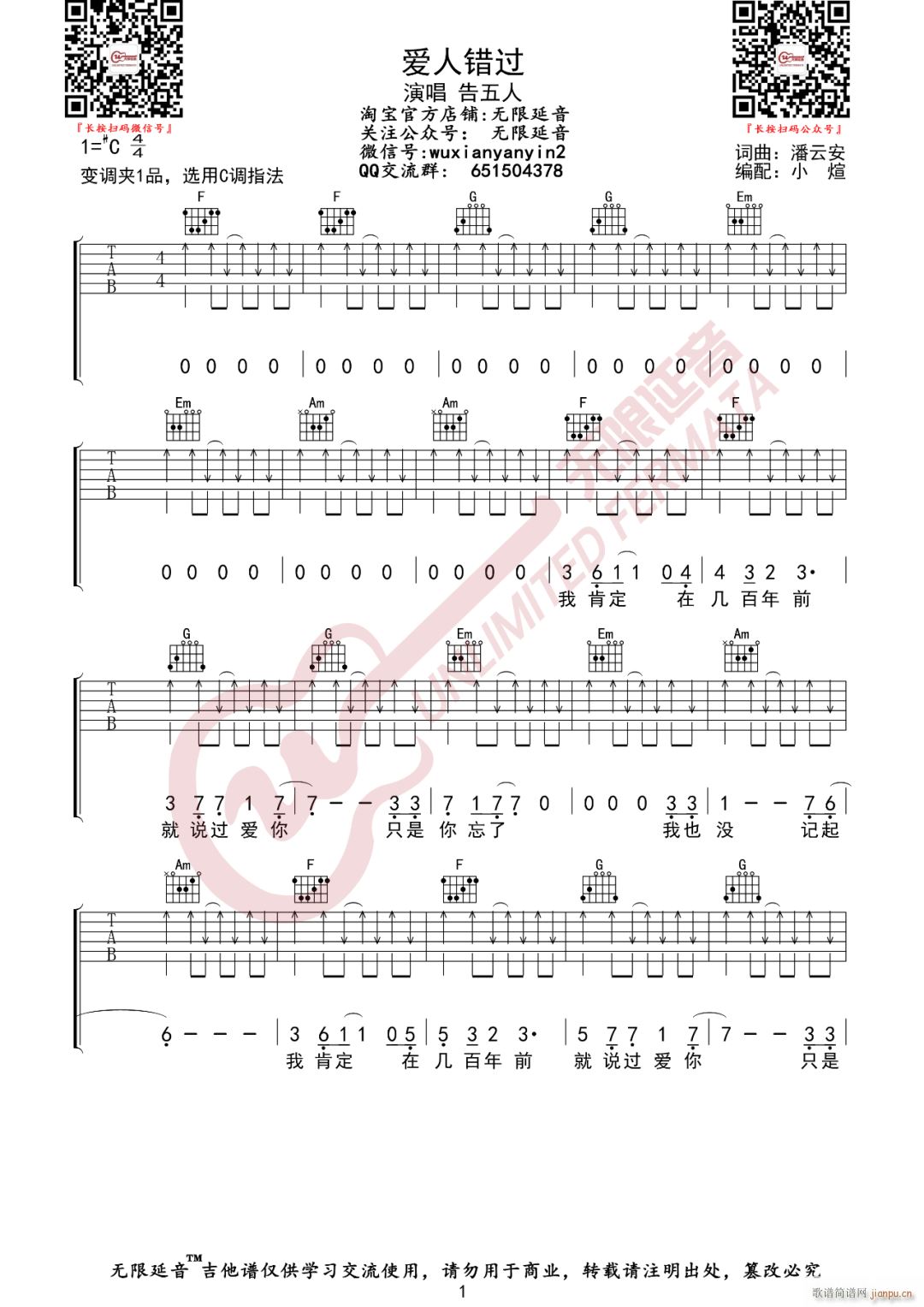 公众号:绵羊乐谱 爱人错过 ( C调原版编配) 免费弹唱吉他谱_六线谱/词曲:告五人 点击: (无限延音) 公众号:绵羊乐谱 | 官方QQ群:978773290 不吃独食,学会分享!本文链接:http://www.shaomingyang.com/btb/35289.html 转载请标明出处,尊重原创(๑╹◡╹)ノ。如信息有误或版权疑问,请通过网站底部联系我们会第一时间处理,感谢理解支持(◕ᴗ◕✿)!