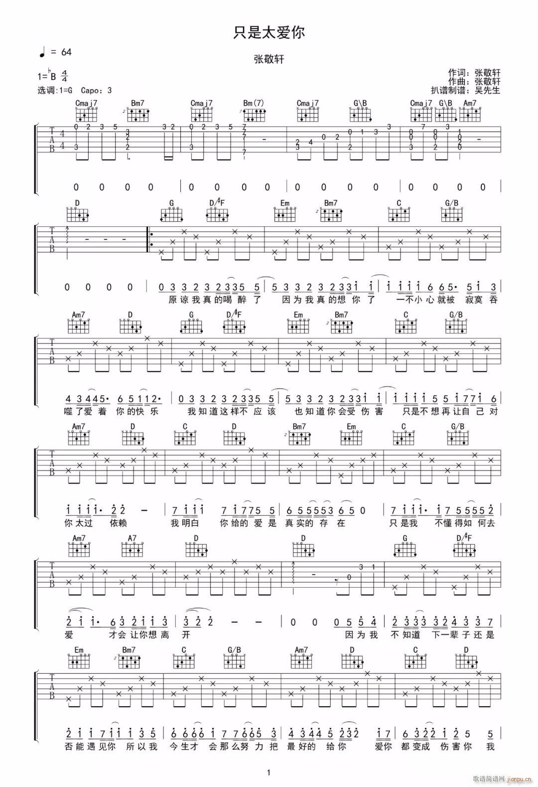 公众号:绵羊乐谱 只是太爱你 ( G调指法原版编配)免费弹唱吉他谱_六线谱/词曲:张敬轩 点击: 1000 图片可能经过缩放,手机长按或点开后长按保存,电脑鼠标右键保存. (网络) 公众号:绵羊乐谱 | 官方QQ群:978773290 不吃独食,学会分享!本文链接:http://www.shaomingyang.com/btb/35347.html 转载请标明出处,尊重原创(๑╹◡╹)ノ。如信息有误或版权疑问,请通过网站底部联系我们会第一时间处理,感谢理解支持(◕ᴗ◕✿)!