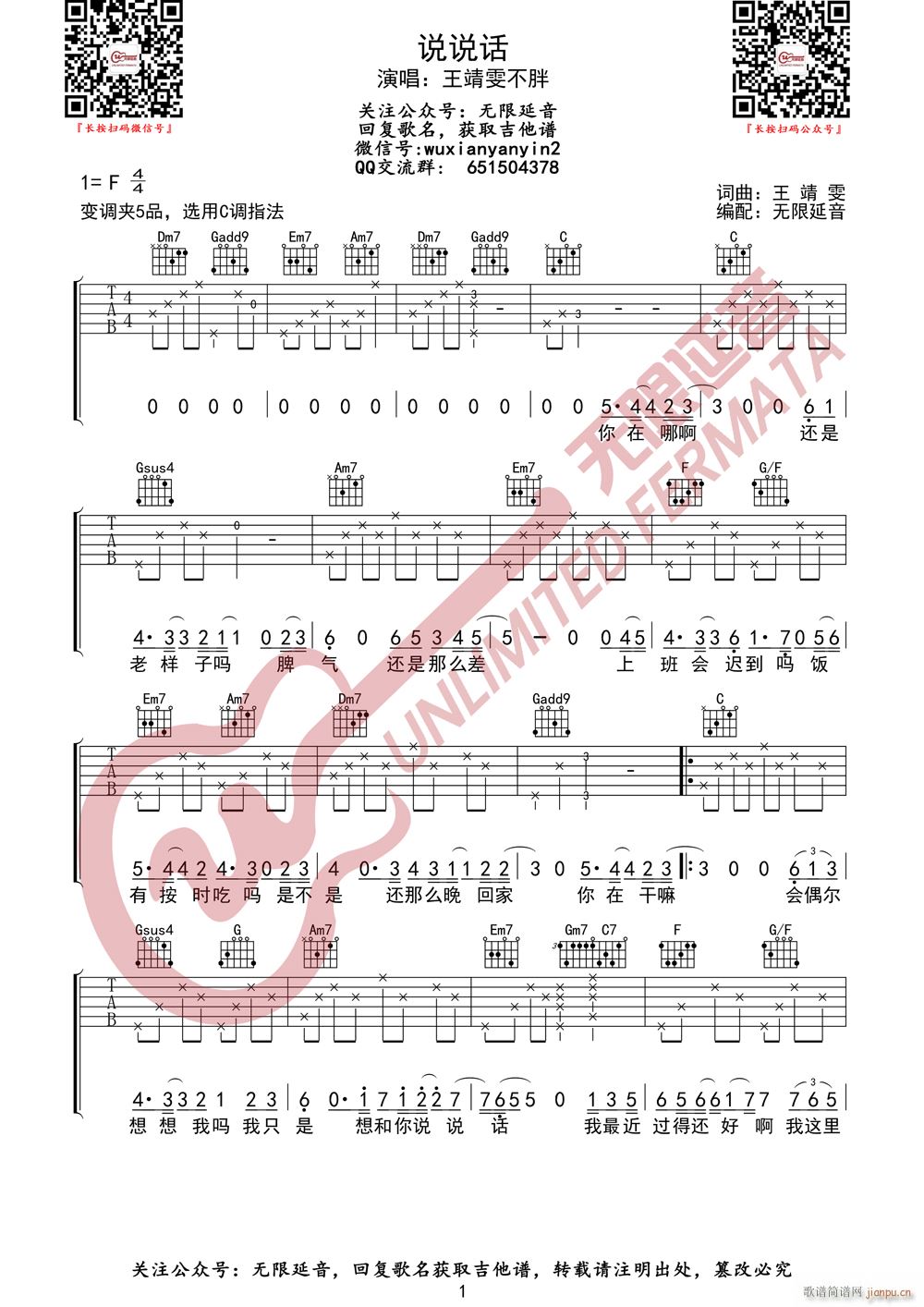 公众号:绵羊乐谱 王靖雯不胖 说说话 (无限延音编配) 免费弹唱吉他谱_六线谱/词曲: 点击: (网络) 公众号:绵羊乐谱 | 官方QQ群:978773290 不吃独食,学会分享!本文链接:http://www.shaomingyang.com/btb/35359.html 转载请标明出处,尊重原创(๑╹◡╹)ノ。如信息有误或版权疑问,请通过网站底部联系我们会第一时间处理,感谢理解支持(◕ᴗ◕✿)!