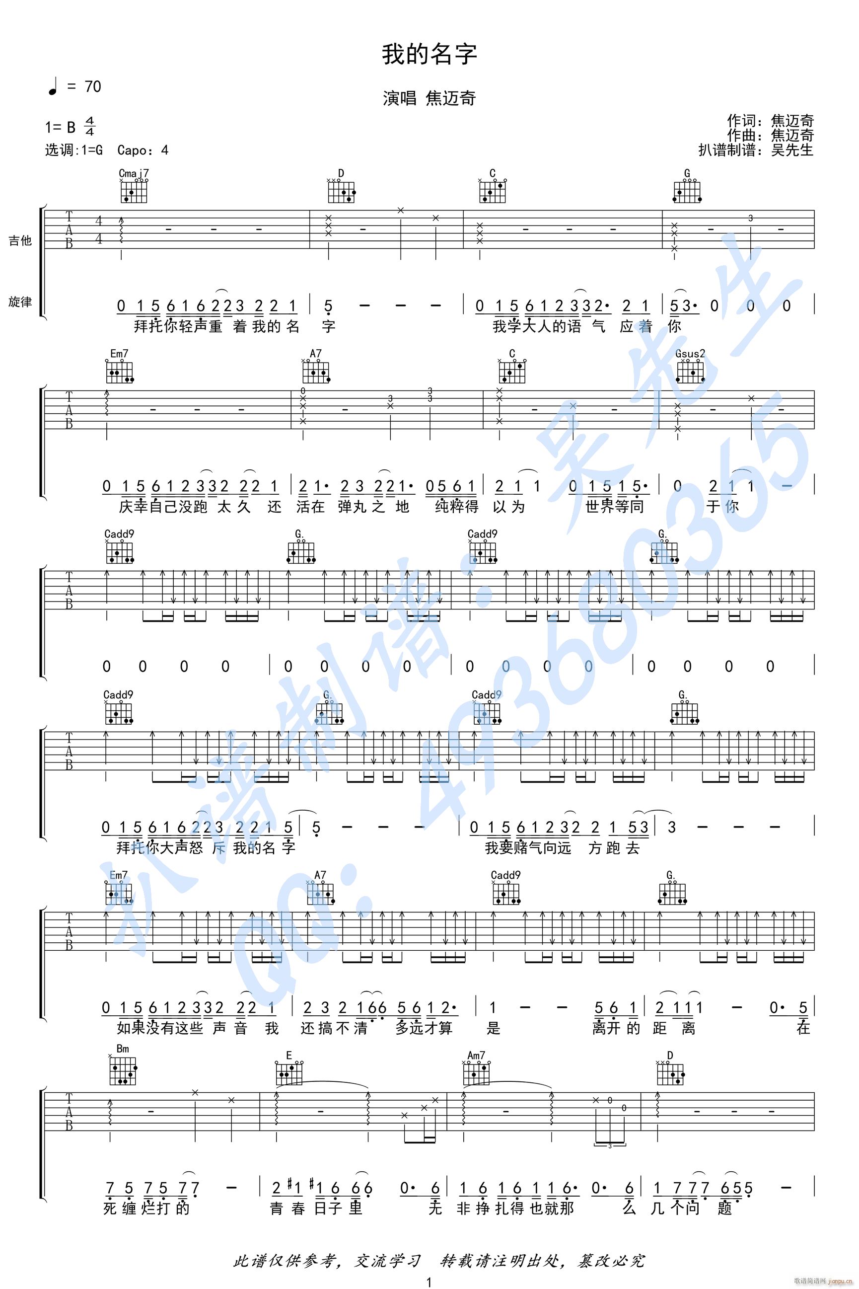 公众号:绵羊乐谱 我的名字 ( G调简单版) 免费弹唱吉他谱_六线谱/词曲:焦迈奇 点击: (网络) 公众号:绵羊乐谱 | 官方QQ群:978773290 不吃独食,学会分享!本文链接:http://www.shaomingyang.com/btb/35379.html 转载请标明出处,尊重原创(๑╹◡╹)ノ。如信息有误或版权疑问,请通过网站底部联系我们会第一时间处理,感谢理解支持(◕ᴗ◕✿)!