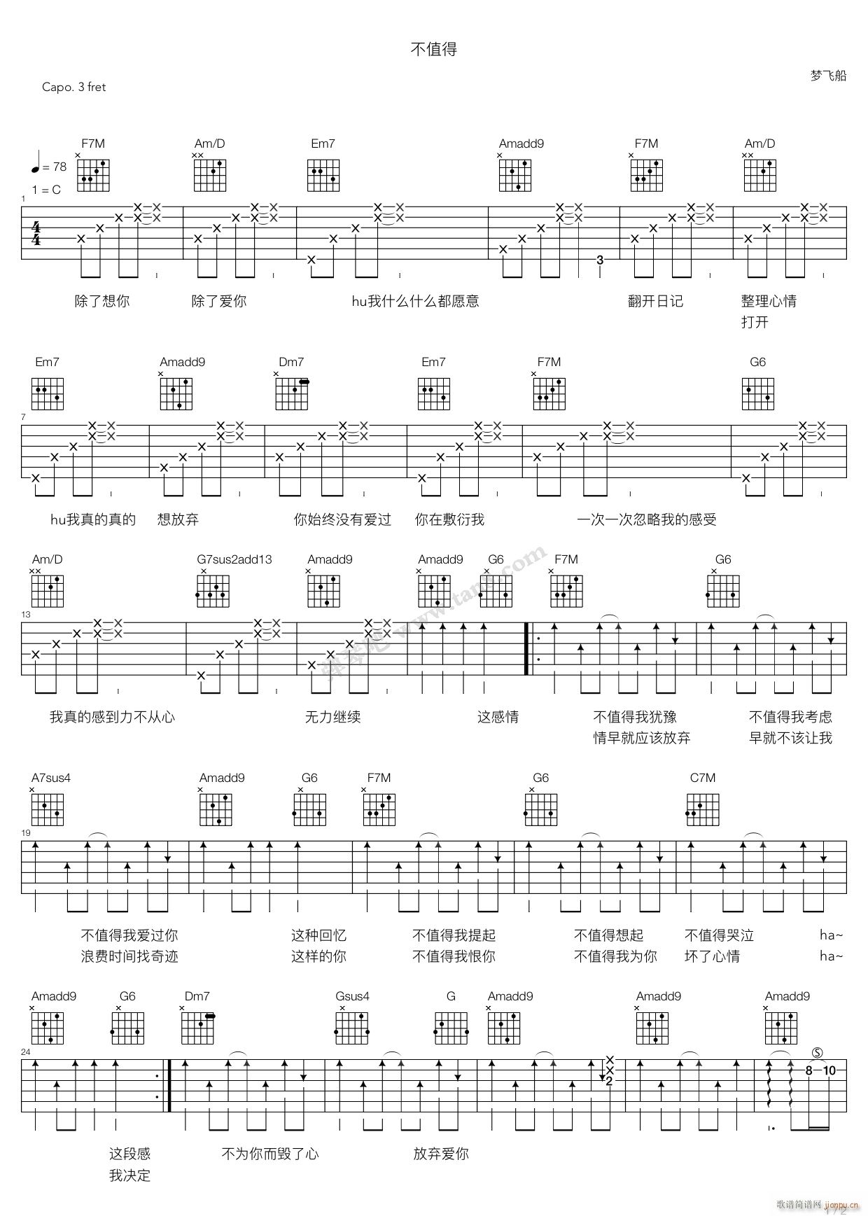 公众号:绵羊乐谱 不值得 ( C调指法原版编配) 免费弹唱吉他谱_六线谱/词曲:梦飞船 点击: (网络) 公众号:绵羊乐谱 | 官方QQ群:978773290 不吃独食,学会分享!本文链接:http://www.shaomingyang.com/btb/35381.html 转载请标明出处,尊重原创(๑╹◡╹)ノ。如信息有误或版权疑问,请通过网站底部联系我们会第一时间处理,感谢理解支持(◕ᴗ◕✿)!