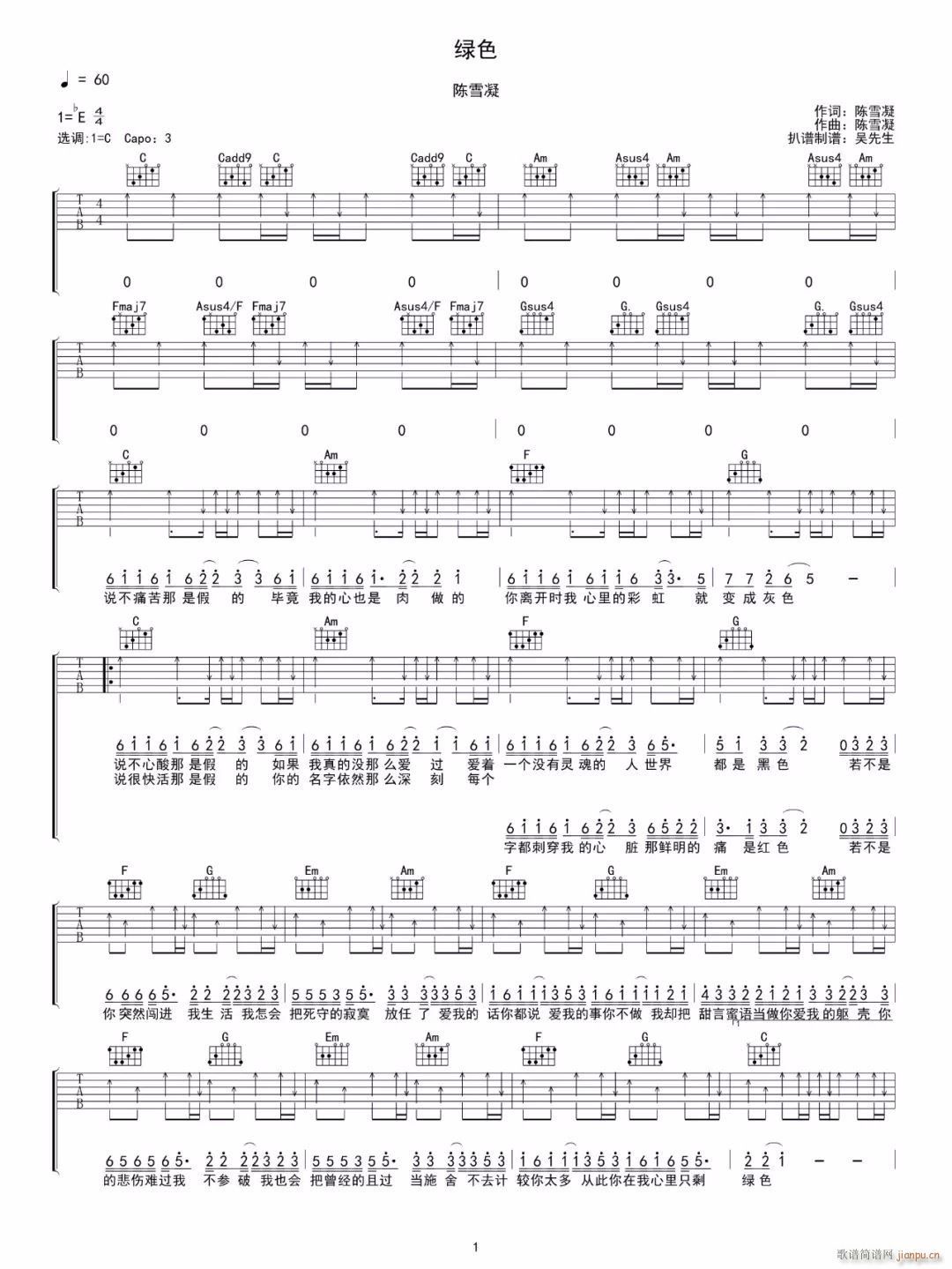 公众号:绵羊乐谱 绿色 ( C调全扫弦版指法) 免费弹唱吉他谱_六线谱/词曲:陈雪凝 点击: (网络) 公众号:绵羊乐谱 | 官方QQ群:978773290 不吃独食,学会分享!本文链接:http://www.shaomingyang.com/btb/35433.html 转载请标明出处,尊重原创(๑╹◡╹)ノ。如信息有误或版权疑问,请通过网站底部联系我们会第一时间处理,感谢理解支持(◕ᴗ◕✿)!