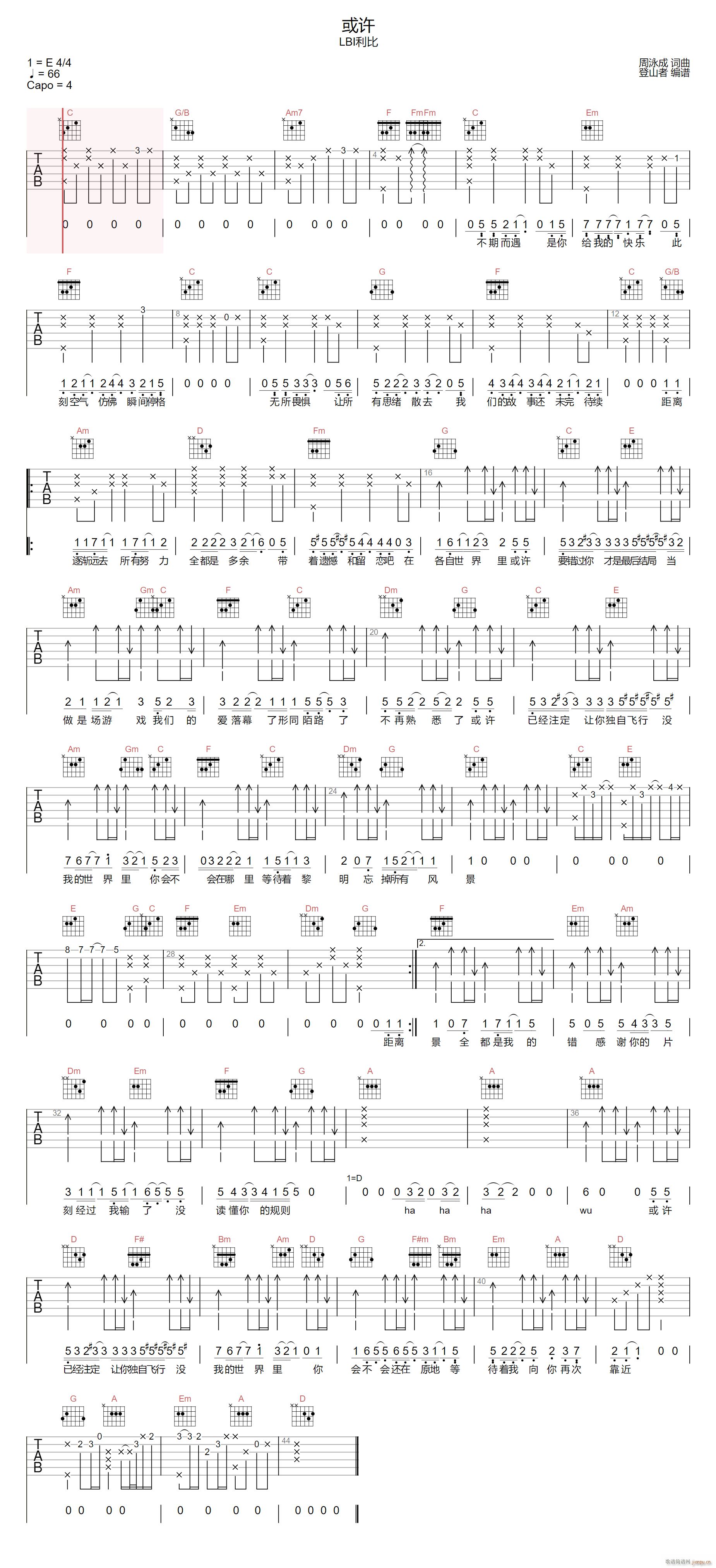 公众号:绵羊乐谱 或许 ( C调指法原版编配)免费弹唱吉他谱_六线谱/词曲:LBI利比 点击: 1000 图片可能经过缩放,手机长按或点开后长按保存,电脑鼠标右键保存. (登山者) 公众号:绵羊乐谱 | 官方QQ群:978773290 不吃独食,学会分享!本文链接:http://www.shaomingyang.com/btb/35618.html 转载请标明出处,尊重原创(๑╹◡╹)ノ。如信息有误或版权疑问,请通过网站底部联系我们会第一时间处理,感谢理解支持(◕ᴗ◕✿)!