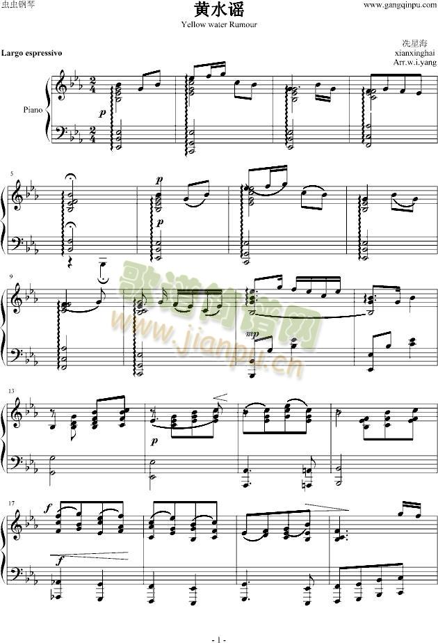 《黄水谣》 完整版免费钢琴谱_五线谱:冼星海 点击: 1000 图片可能经过缩放,手机长按或点开后长按保存,电脑鼠标右键保存.