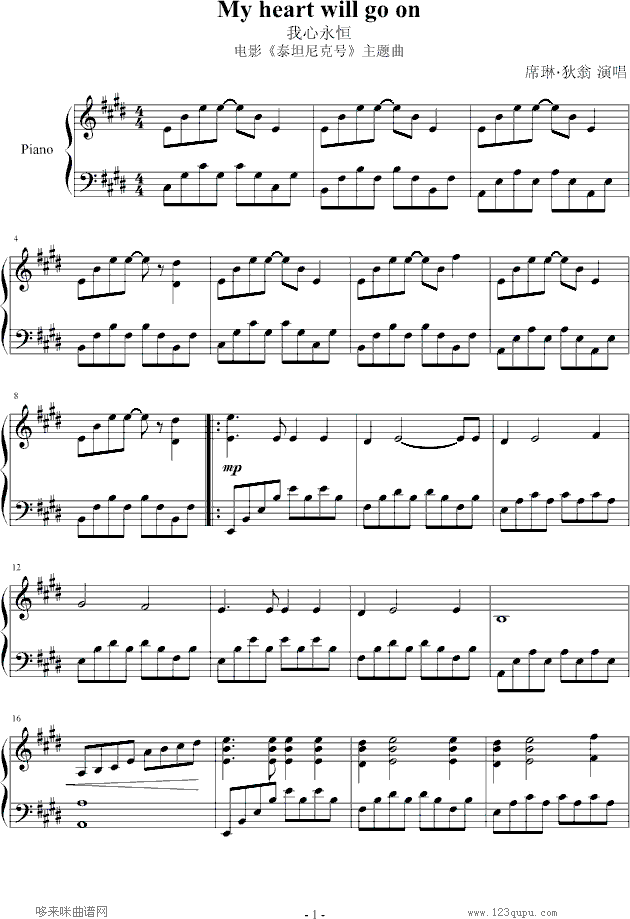 My heart will go on(我心永恒)-影视免费钢琴谱_五线谱:未知 点击: 1000 图片可能经过缩放,手机长按或点开后长按保存,电脑鼠标右键保存.