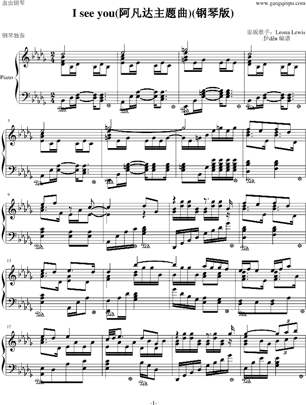 I see you(阿凡达主题曲)(钢琴版)-钢琴谱(钢琴曲)-Leona Lewis免费钢琴谱_五线谱: 点击: 1000 图片可能经过缩放,手机长按或点开后长按保存,电脑鼠标右键保存.