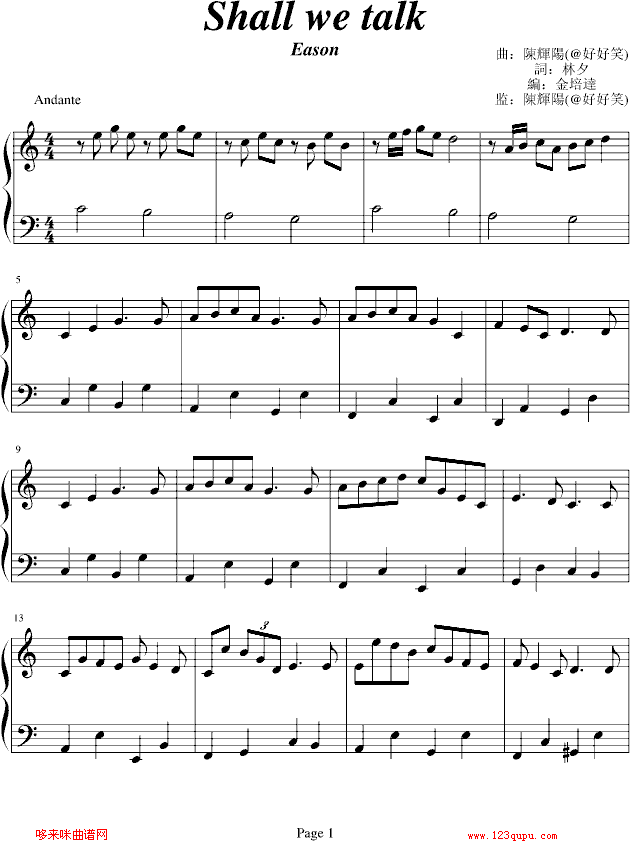 Shall We Talk-陈奕迅免费钢琴谱_五线谱:未知 点击: 1000 图片可能经过缩放,手机长按或点开后长按保存,电脑鼠标右键保存.